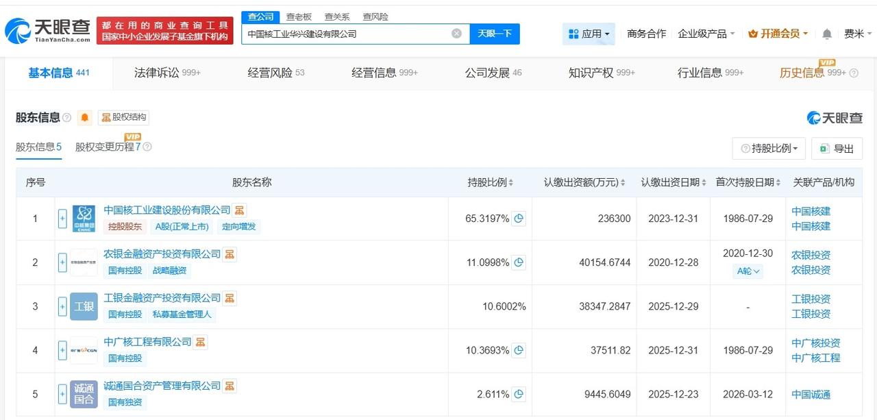 天眼查App显示,近日,中国核工业华兴建设有限公司发生工商变更,新增工银金融资产投资有限公司为股东,同时,注册资本由约32.3亿人民币增至约36.2亿人民币,增幅约12%。