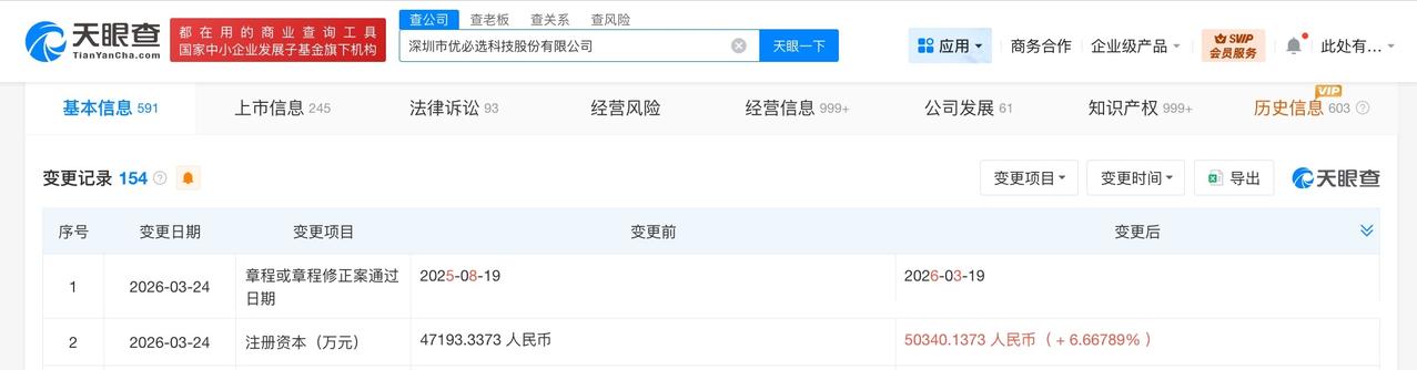 天眼查App显示,近日,优必选(09880.HK)发生工商变更,注册资本由约4.7亿人民币增至约5亿人民币,增幅约7%。