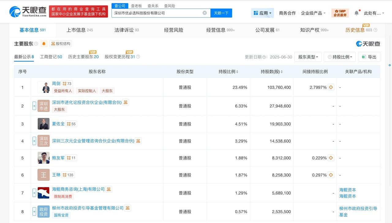深圳市优必选科技股份有限公司成立于2012年3月,法定代表人为周剑,经营范围含从事智能机器人、人工智能算法、软件、通讯设备、玩具及相关领域的技术研发、技术咨询等。股东信息显示,该公司由周剑、深圳市进化论投资合伙企业(有限合伙)、夏佐全等共同持股。