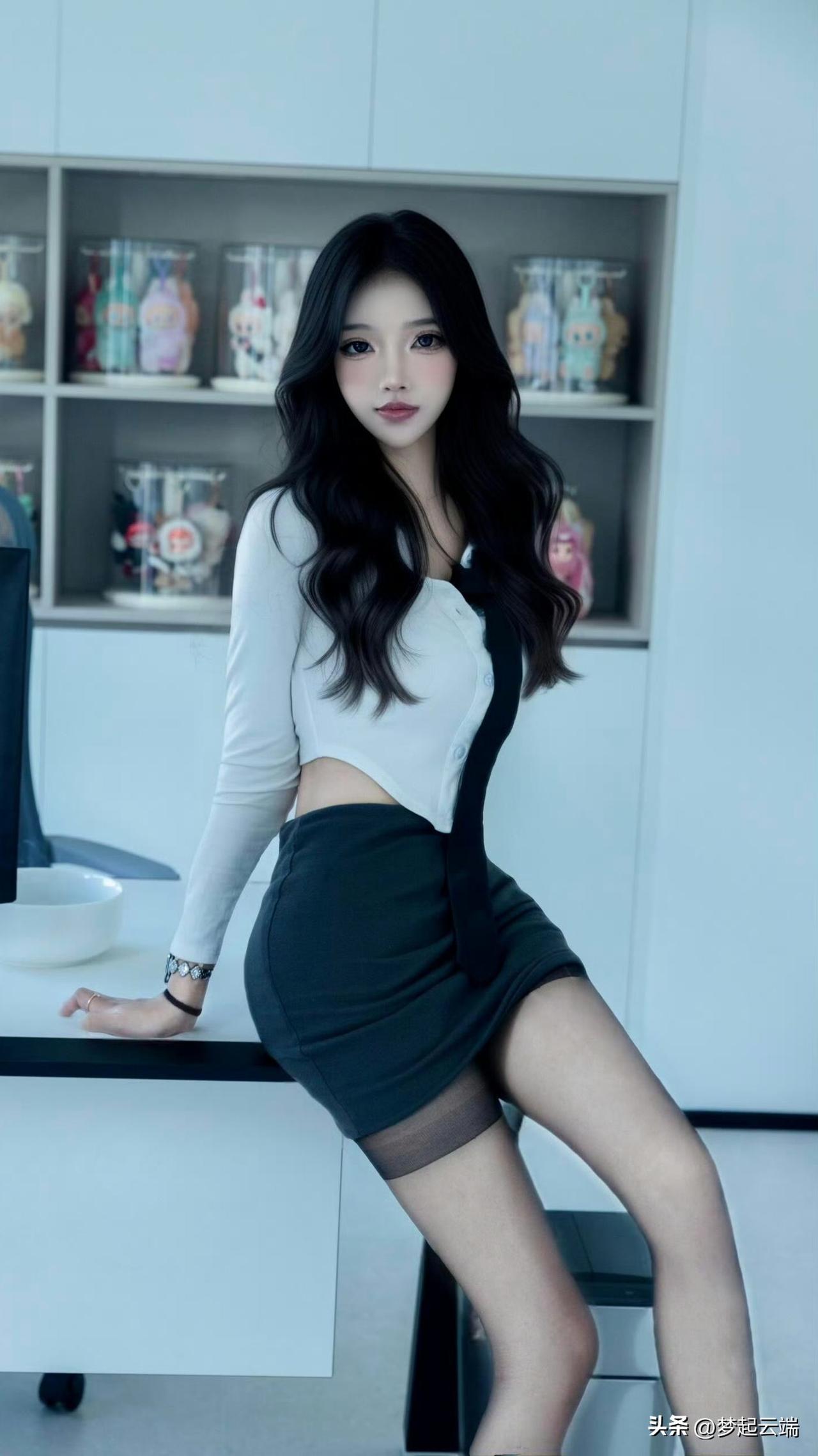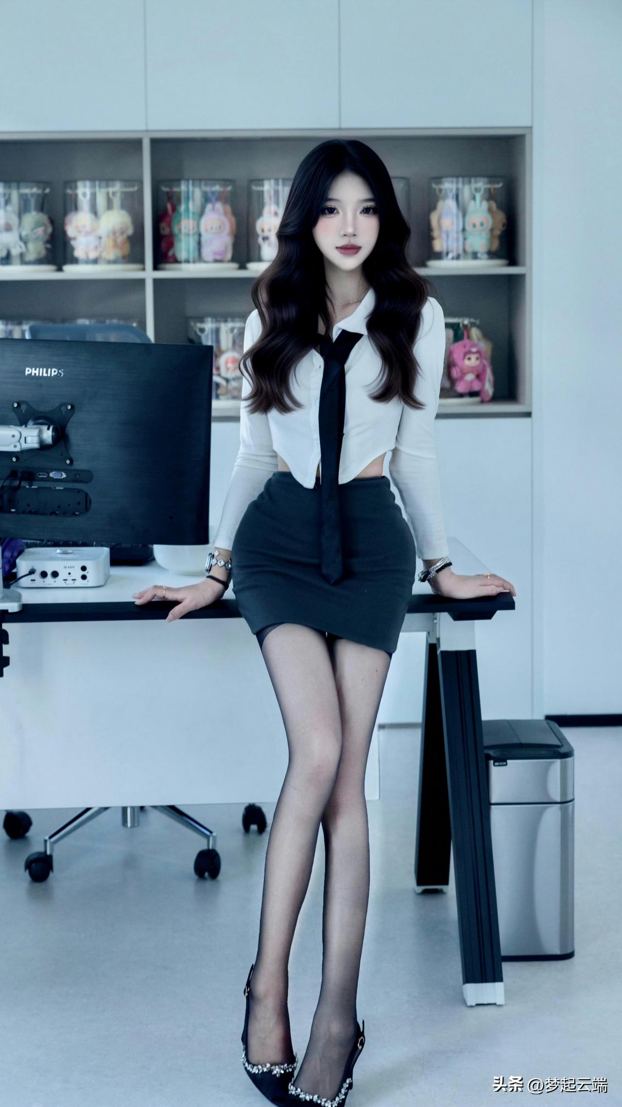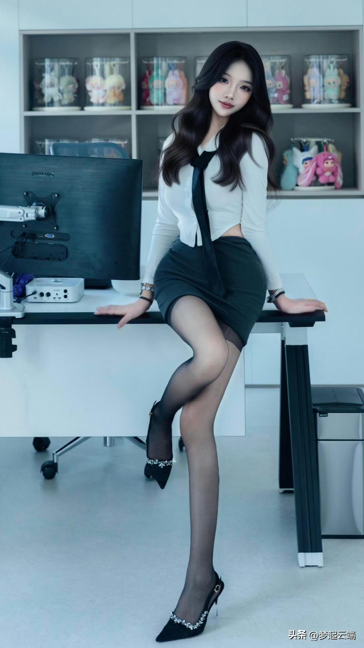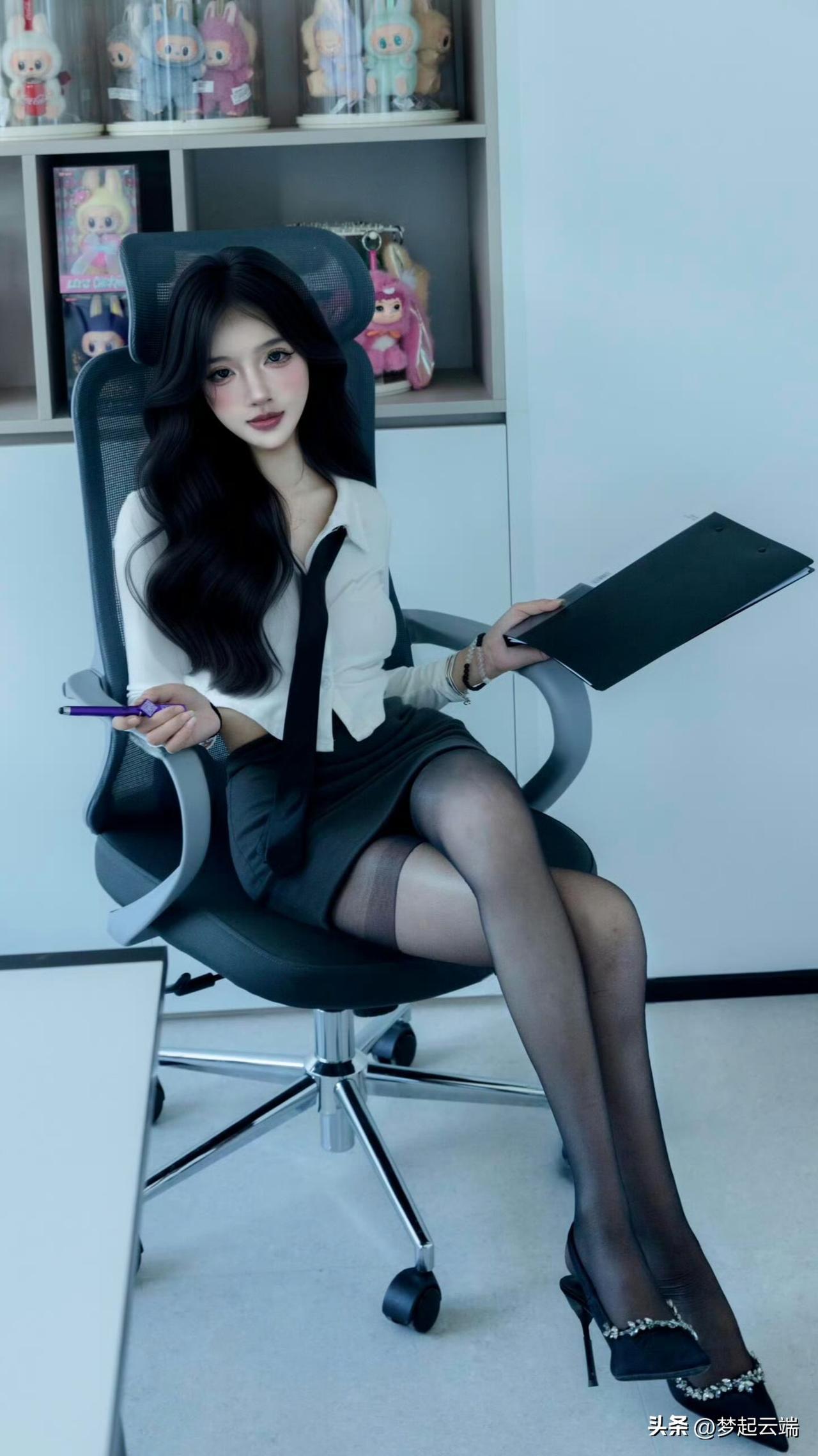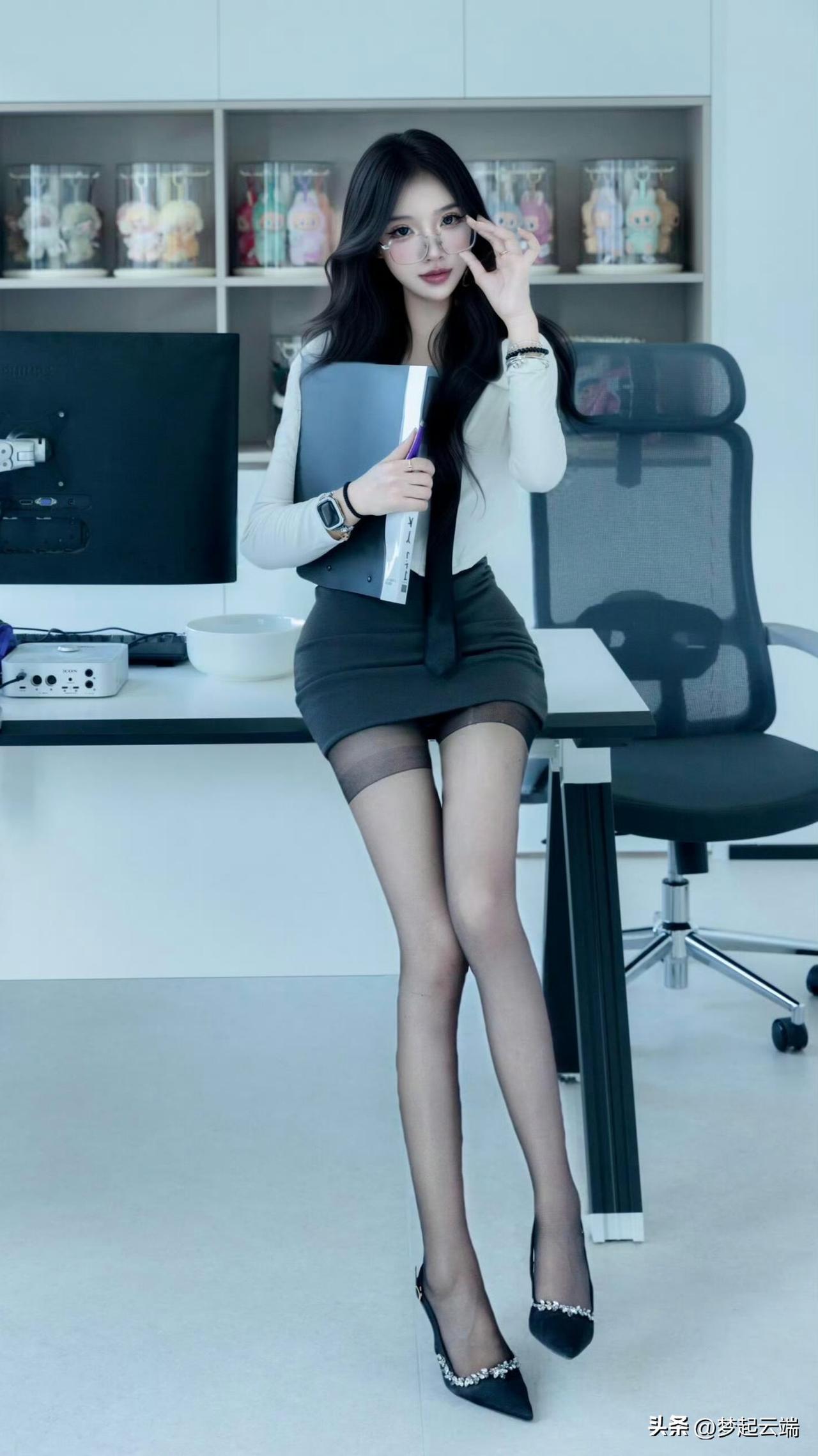 优雅办公女郎,黑丝高跟鞋,时尚眼镜,职场风范。
