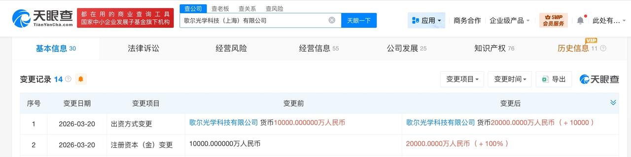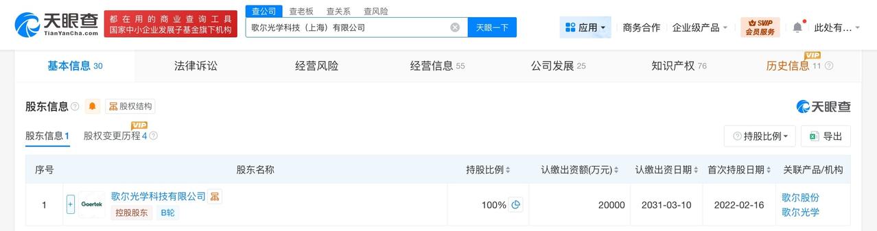 天眼查工商信息显示,近日,歌尔光学科技(上海)有限公司发生工商变更,注册资本由1亿人民币增至2亿人民币,增幅100%。