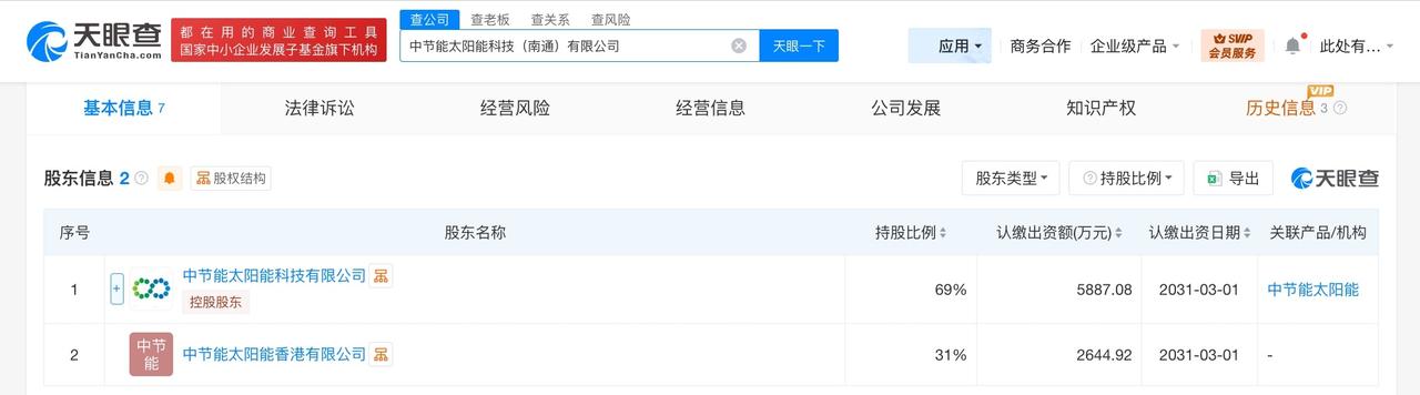 天眼查工商信息显示,近日,中节能太阳能科技(南通)有限公司成立,法定代表人为王振国,注册资本8532万人民币,经营范围包括太阳能发电技术服务、光伏设备及元器件销售、光伏发电设备租赁等。股东信息显示,该公司由中节能太阳能科技有限公司、中节能太阳能香港有限公司共同持股。