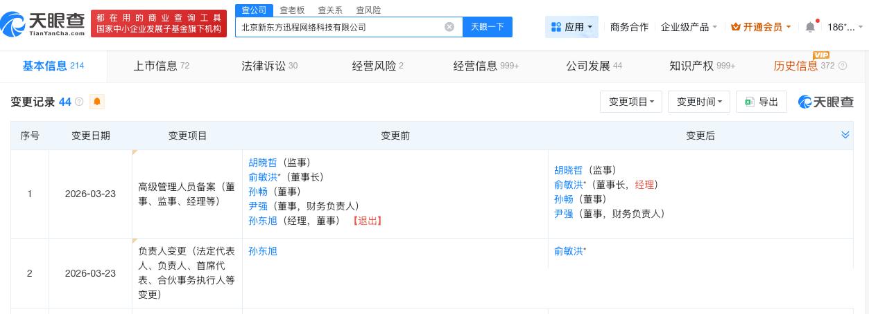 天眼查工商信息显示,近日,东方甄选关联北京新东方迅程网络科技有限公司发生工商变更,孙东旭卸任法定代表人、董事、经理,俞敏洪接任法定代表人、经理。
