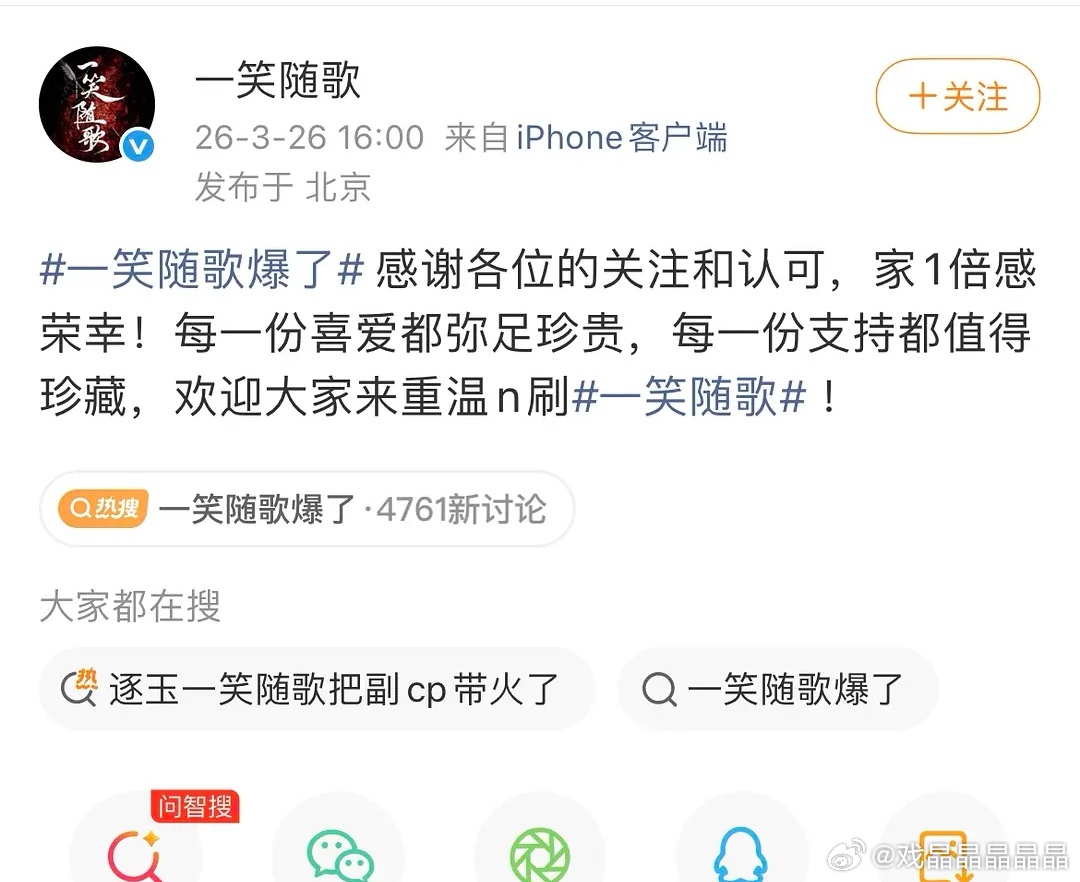 一笑随歌爆了笑不行了,逐玉不仅让何润东几天涨粉百万,还让一笑随歌二爆,官博都出来