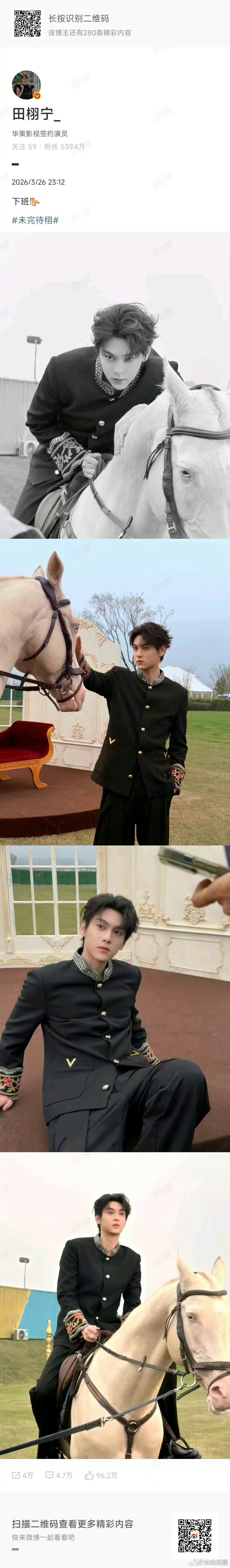 【#田栩宁下班plog#】3月26日,演员在结束直播工作后发布4张live图并配文“下班”。照片中,田栩宁身着骑士装、策马远眺,传递“少年成长为王子,王子蜕变为骑士”的进阶叙事。戳更多>>#田曦薇张凌赫 二搭##白敬亭郑合惠子互动##谢征樊长玉被窝戏删掉了##田栩宁忘词##孟子义李昀锐装不熟#(大河报)(编辑:张子皓;审签:艾渝)