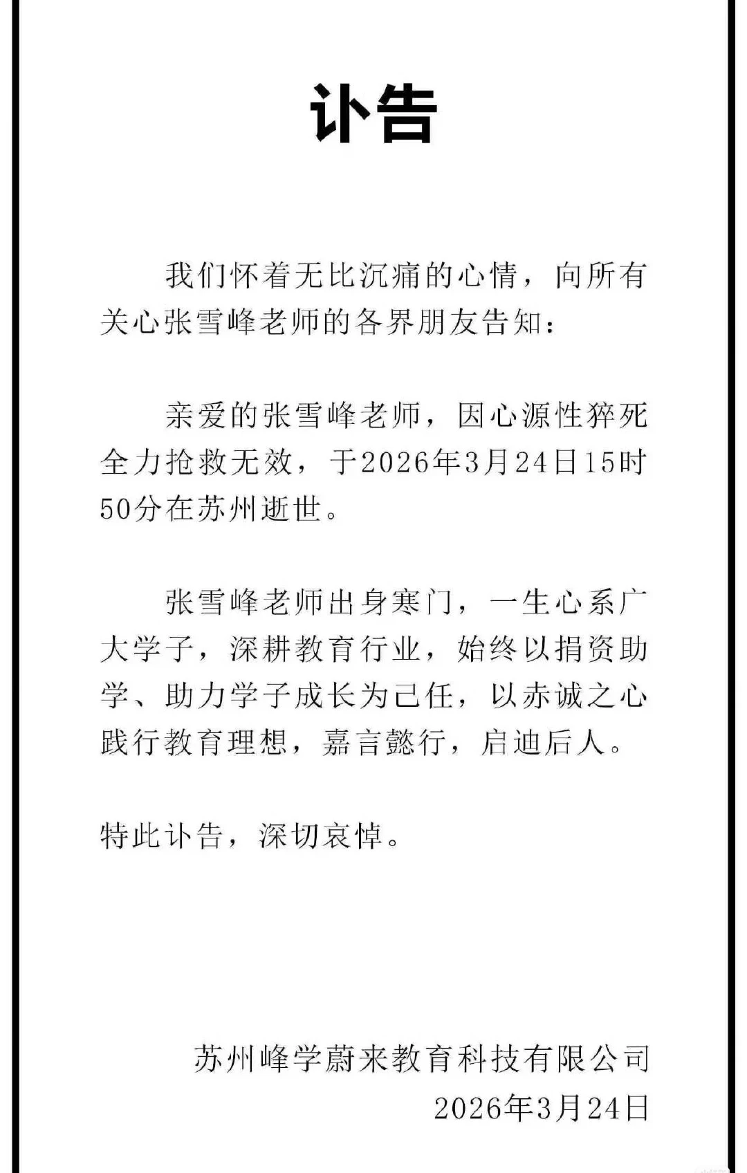 天妒英才,哲人其萎。您虽匆匆离去,但留下的教育初心与育人情怀,将永远镌刻在每一位受惠学子心中。愿您一路走好,天堂无病痛,安息有清风。