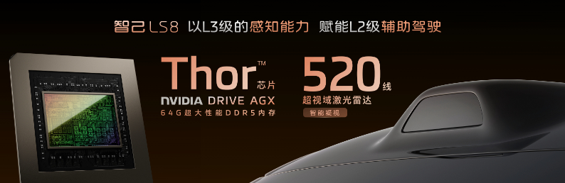 智己LS8搭载IM AD辅助驾驶,拥有英伟达Thor芯片,并且满血配备64GB高性能LPDDR5X内存、采用了520线超视域激光雷达。