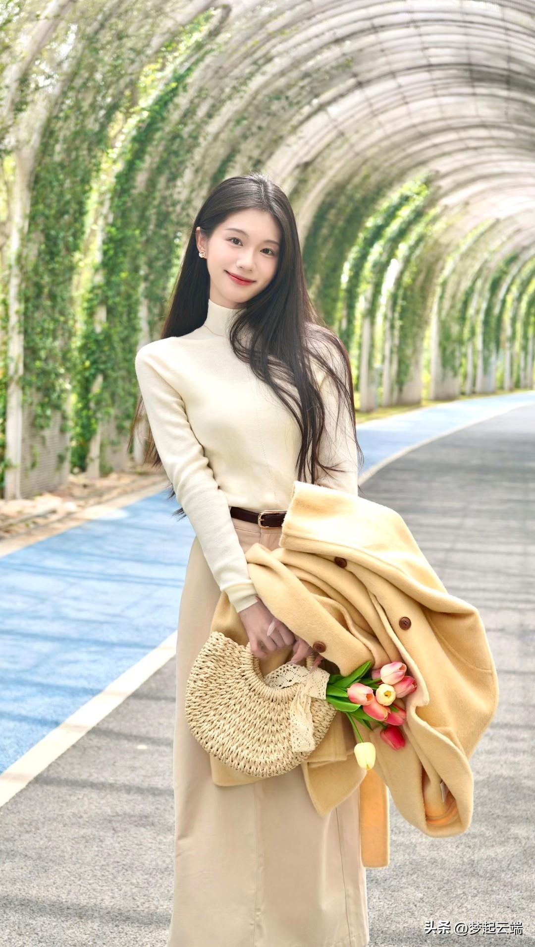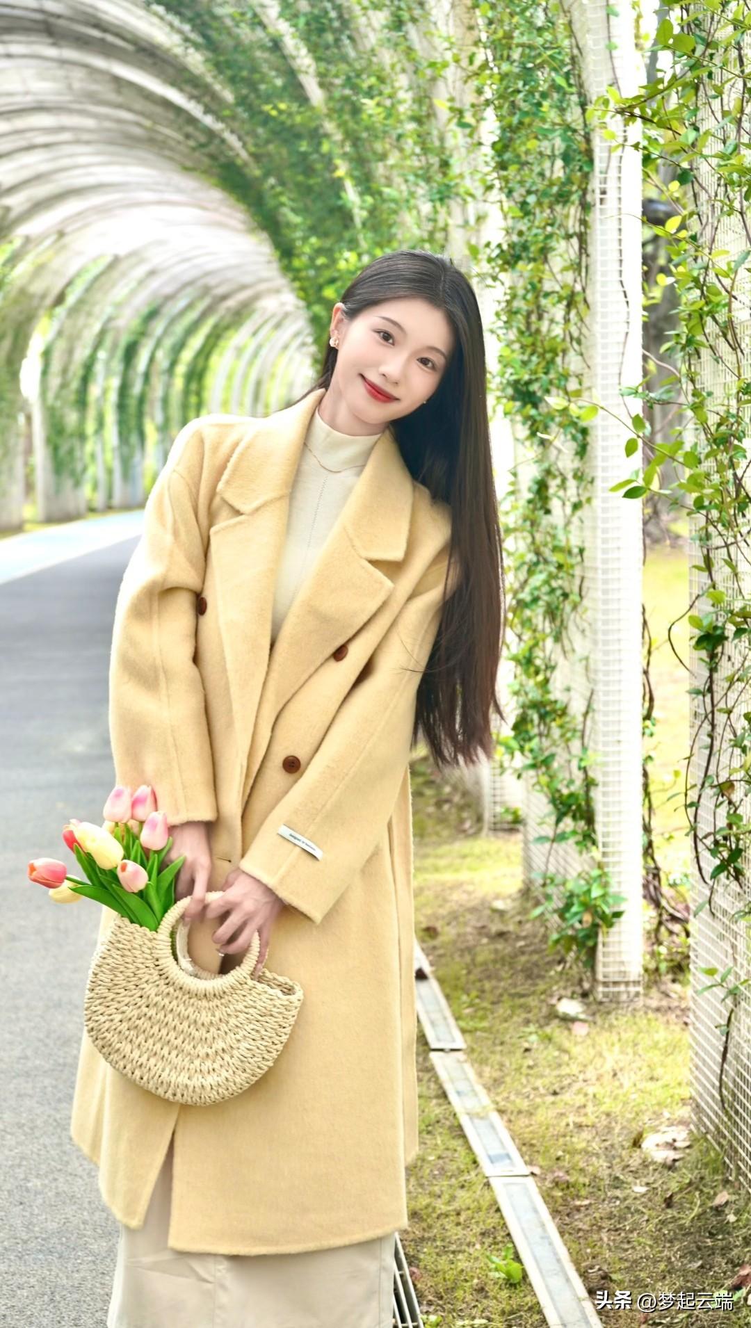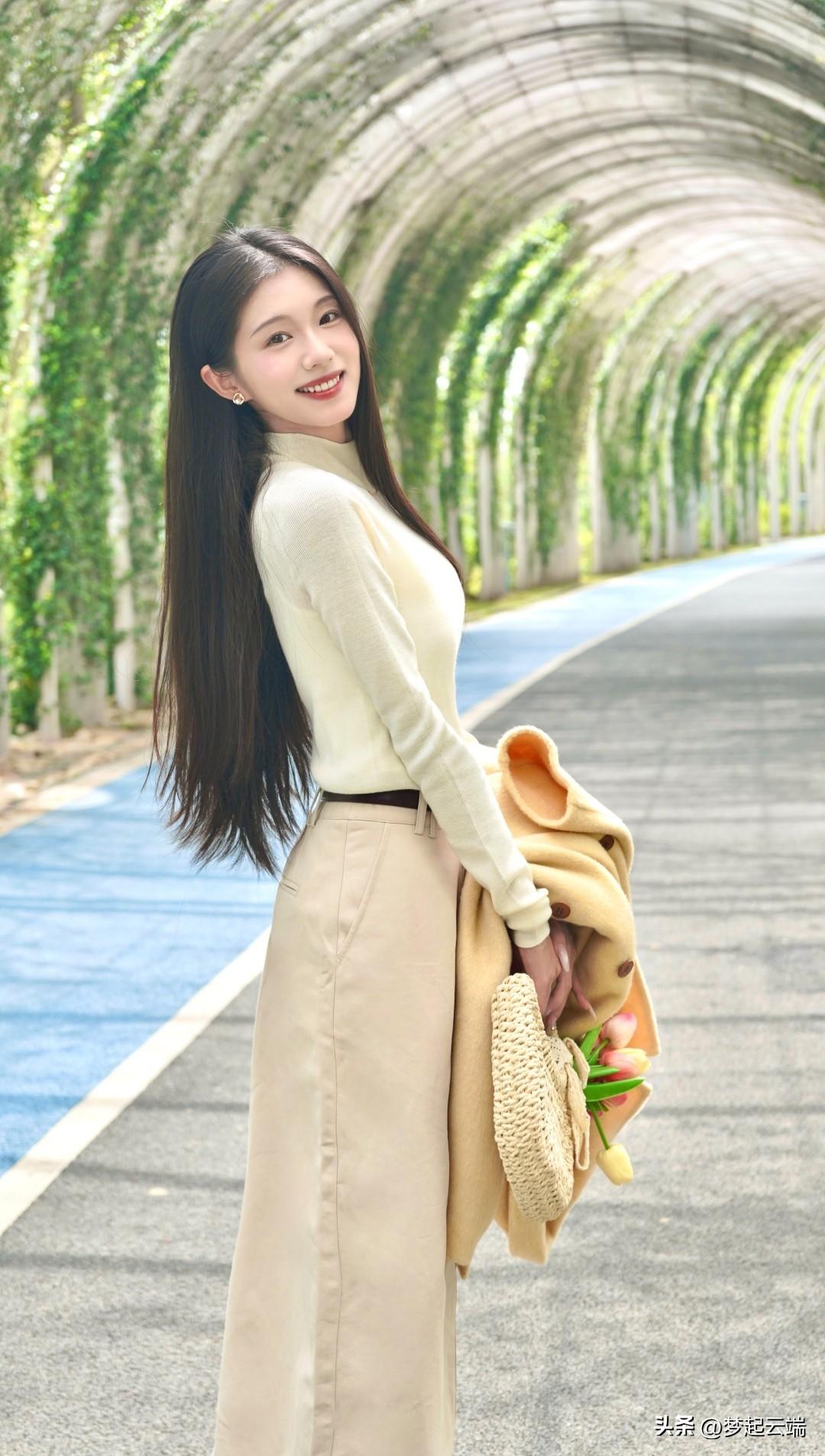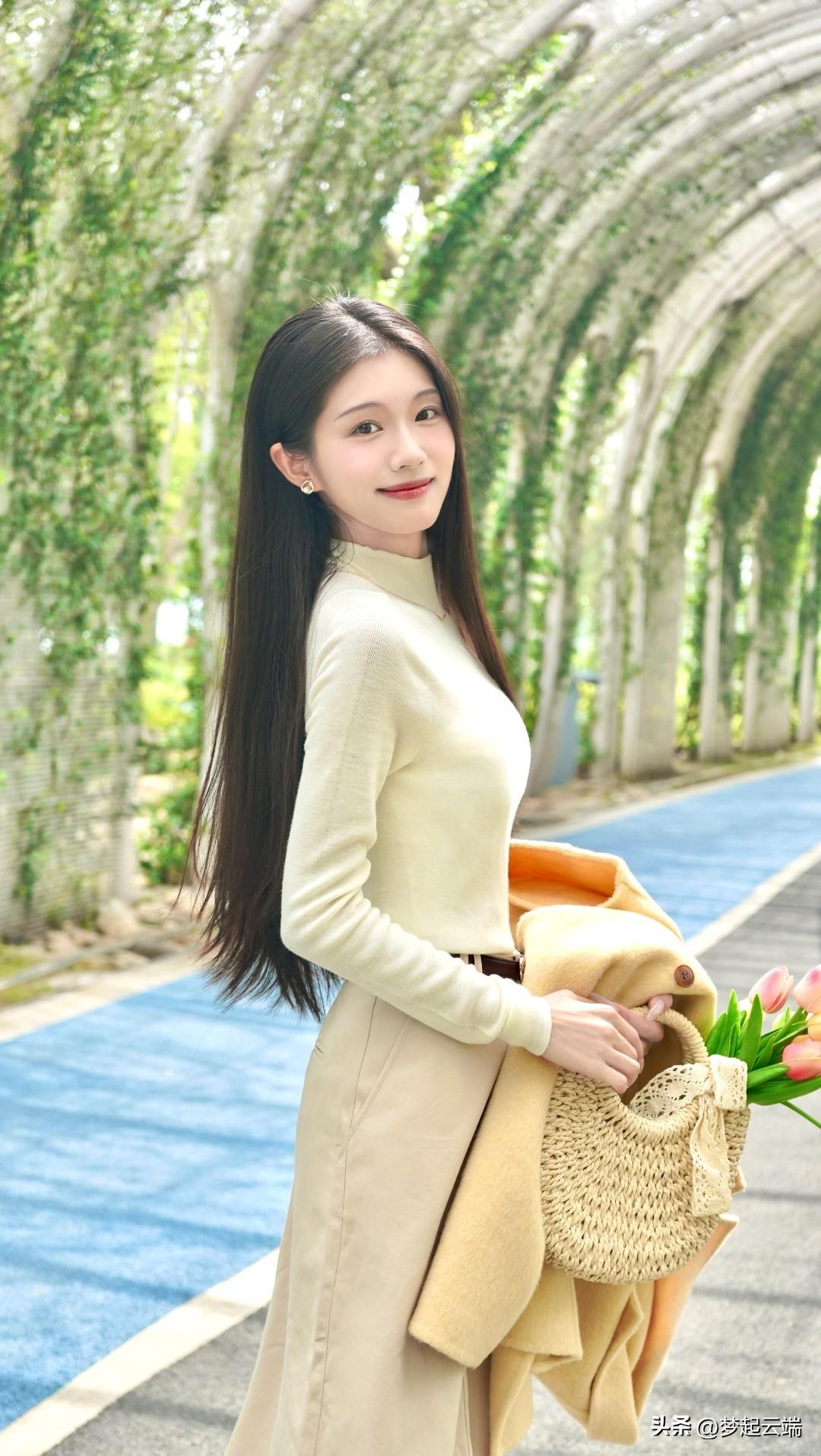 在绿意盎然的隧道里,她温柔地微笑,手捧一束花,散发着春天的气息。