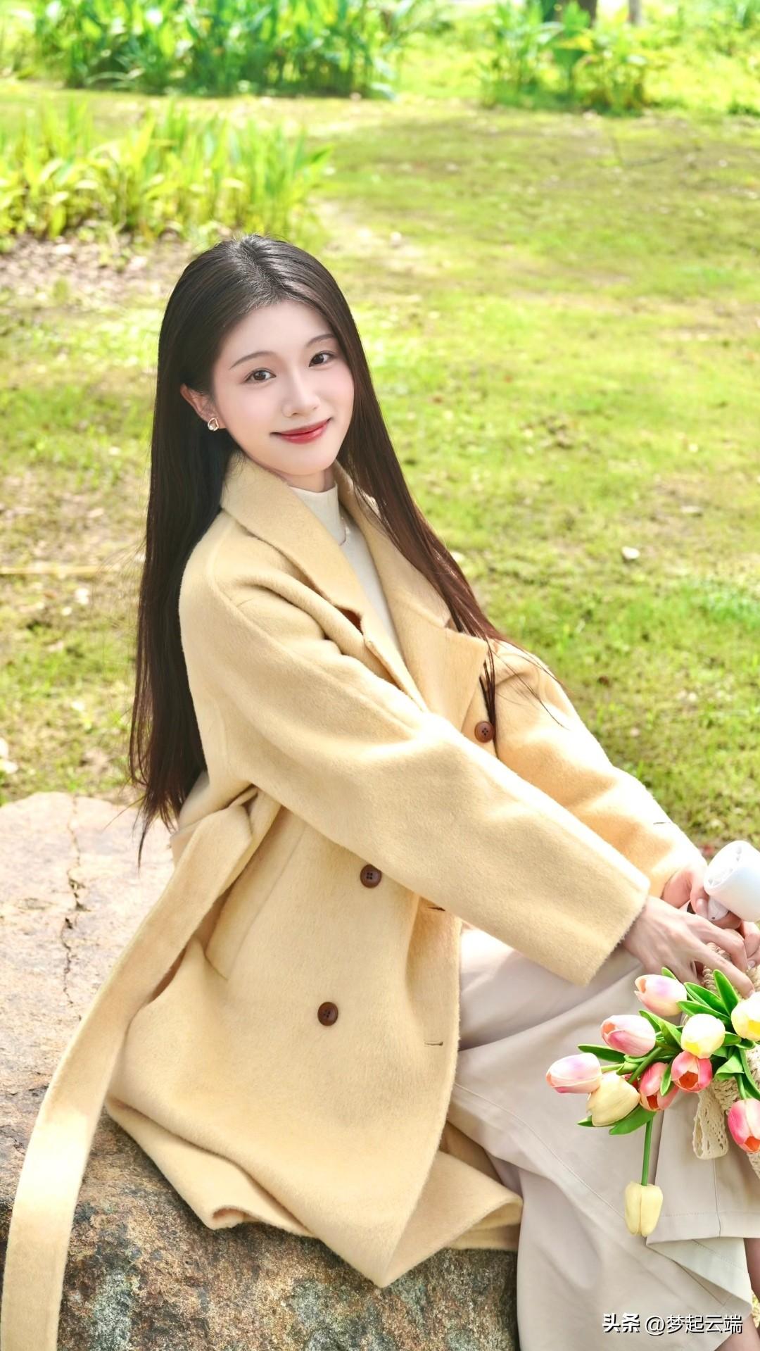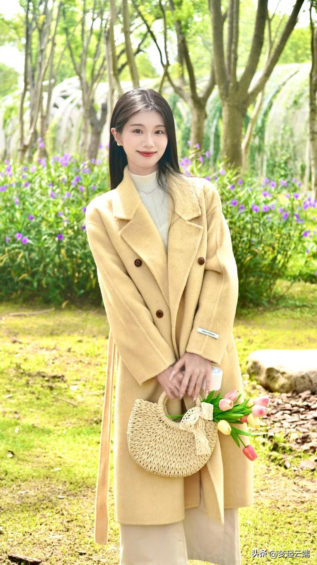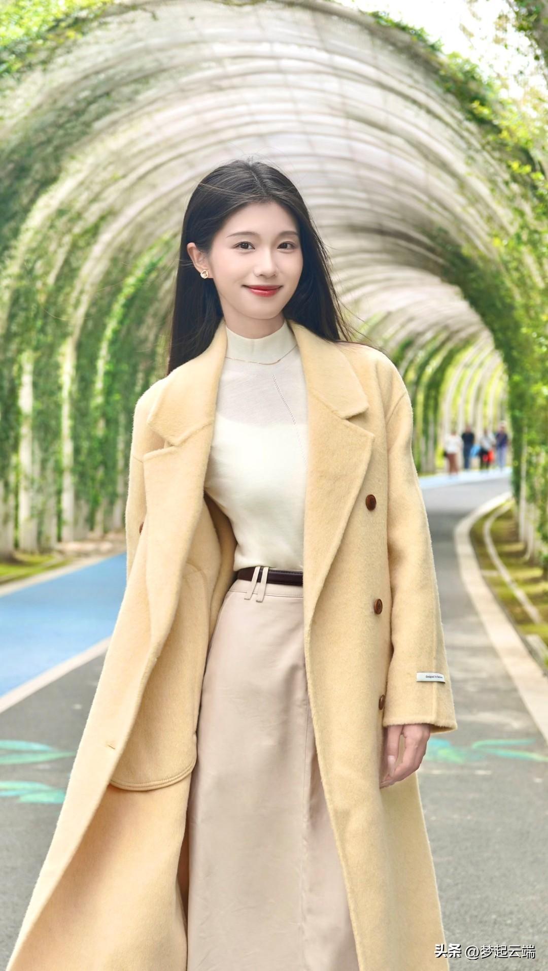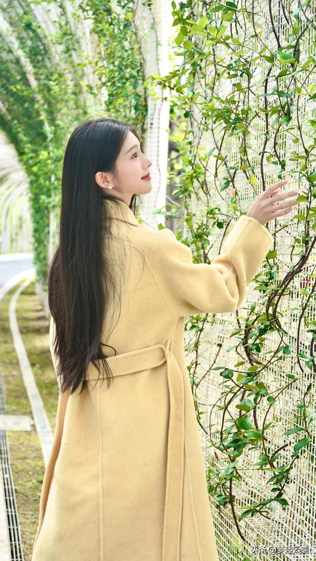 在绿意盎然的隧道里,她温柔地微笑,手捧一束花,散发着春天的气息。