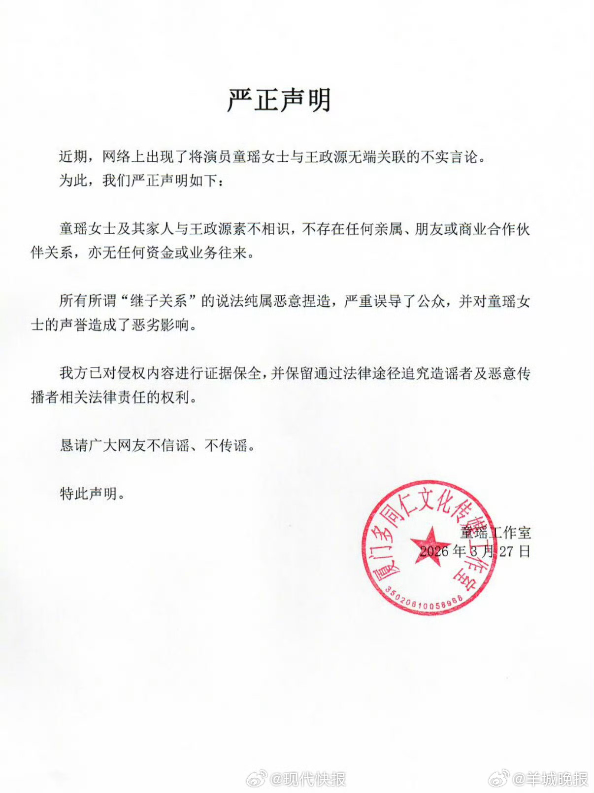 #童瑶工作室回应网传继子#【#童瑶方称和王政源素不相识#】针对近期网络上出现将演员与王政源无端关联的言论,3月27日,发布严正声明:童瑶女士及其家人与王政源素不相识,不存在任何亲属、朋友或商业合作关系,亦无任何资金或业务往来,所谓“继子关系”纯属恶意捏造。我方已对侵权内容进行证据保全,并保留通过法律途径追究造谣者及恶意传播者责任的权利,也恳请广大网友不信谣、不传谣,共同维护良好的网络环境。(现代快报)更多消息:#商K##刘昊然 郭麒麟##地坛公园不再允许用明星姓名认领树##Lisa生日晒泳装照##严浩翔 KTV##没认出来这是王子异#(编辑:惠天骄;审签:艾渝)