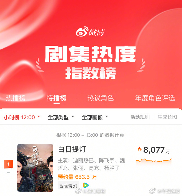 【#白日提灯剧集热度指数超8000万#】#白日提灯预约量超653万疑似严浩翔社交平台小号##乘风2026定档##商K##郭麒麟对接回应KTV传闻##刘芸15岁儿子近照##刘昊然 郭麒麟#(编辑:惠天骄;审签:艾渝)