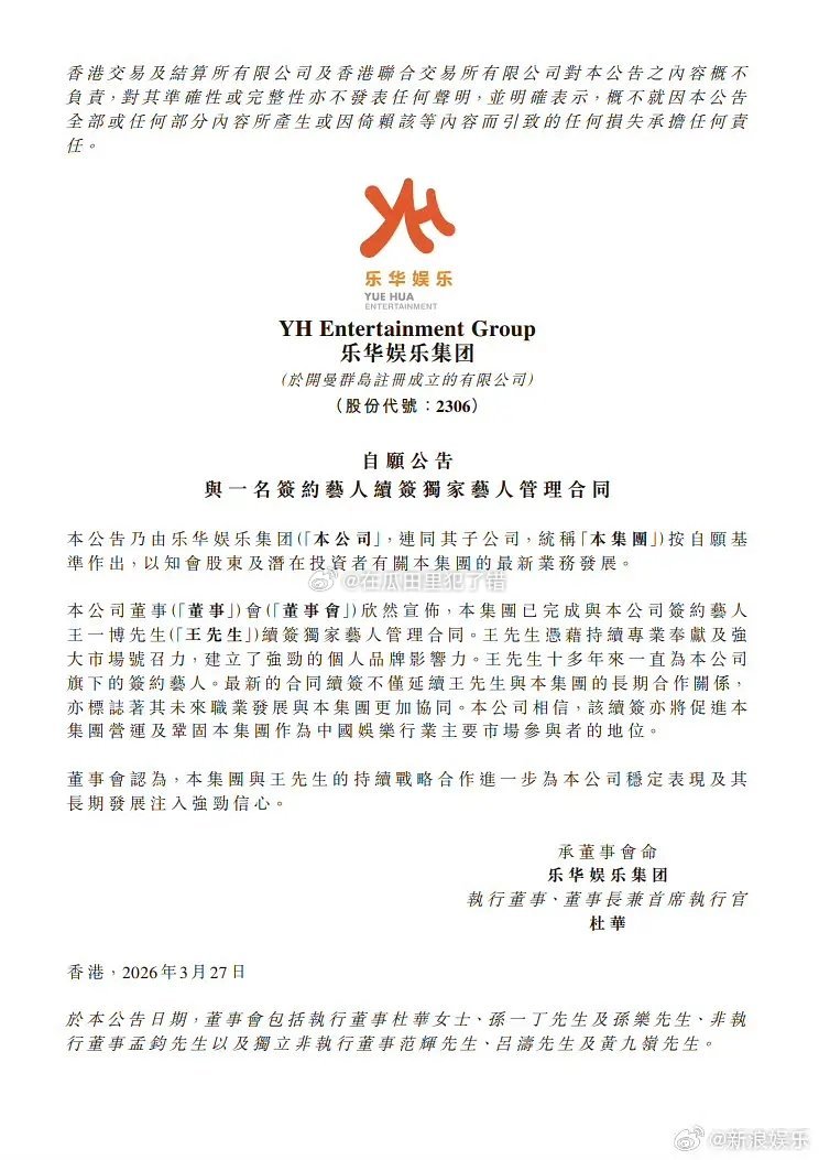 王一博和乐华续约,正式公告出来了