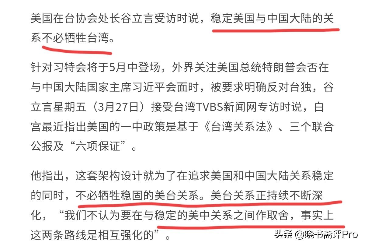 没想到美国还跟我们玩两面手法!3月27日,美国在台协会处长谷立言受访时声称,稳定美国与中国大陆的关系不必牺牲台湾。美国的一中政策是基于《台湾关系法》、三个联合公报及“六项保证”。这套架构设计就为了在追求美国和中国大陆关系稳定的同时,不必牺牲稳固的美台关系。 谷立言表示,美台关系正持续不断深化,我们不认为要在与稳定的美中关系之间作取舍,事实上这两条路线是相互强化的。很显然,谷立言的意思是,美国一方面可以继续对台军售,一方面还可以稳定中美关系。但是,从我们的角度而言,这绝无可能。事实上,这个所谓的一中政策,根本不是一中政策,而是在一中政策的名义下,不断的夹带私货,掏空一中政策。 说白了,美国是握着台湾牌,准备两边要好处,本质上就是以台遏华。要确保中美关系稳定,台湾问题就是最基本的前提。美国的这一立场,这也是提醒我们,美国还没有死心。当然,我们对美国也没有幻想。解决台湾问题,归根结底就是由中美实力决定的,现在台海实力天平正在向我们倾斜,美国妄图“两全其美”,但其算盘注定将落空。