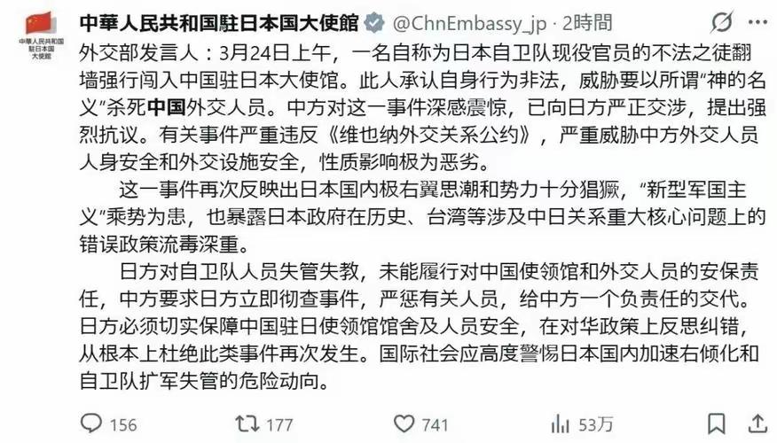 日本现役军人,带刀翻墙闯进中国驻东京大使馆,还叫嚣要“以神的名义”伤害中国外交官。 这事放哪国都是天大的外交丑闻。更讽刺的是,日本政府一开始就四个字——“深表遗憾”,想往“个人行为”上推,糊弄过去。 中国没惯着,当场甩出三点要求:查清事实、严惩肇事者、公开交代。24小时之内,日本态度急转弯——内阁官房长官亲自鞠躬道歉,增派警力24小时警戒。 日本为什么怂了?因为全世界都盯着,核污水、台湾问题、钓鱼岛,账还没还完呢。 但最该警惕的不是道歉,而是自卫队内部已经渗进了极端思想。军国主义那套,在日本压根没死透。这次闯的是使馆,下次呢?中方正告日本 中国驻日本 东京中国人遭袭