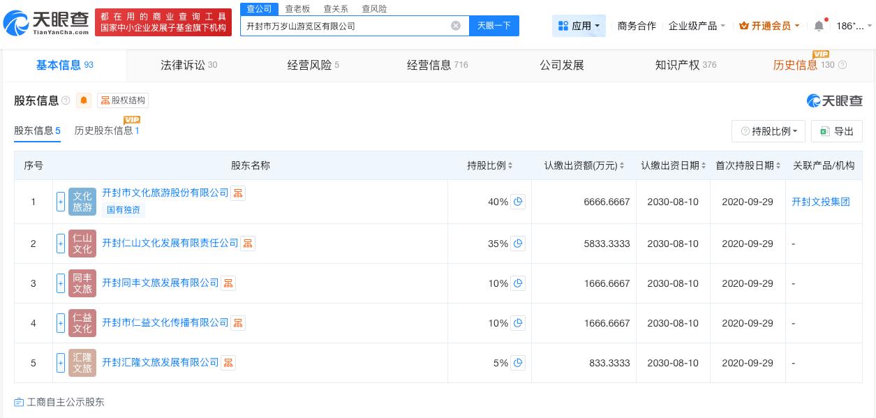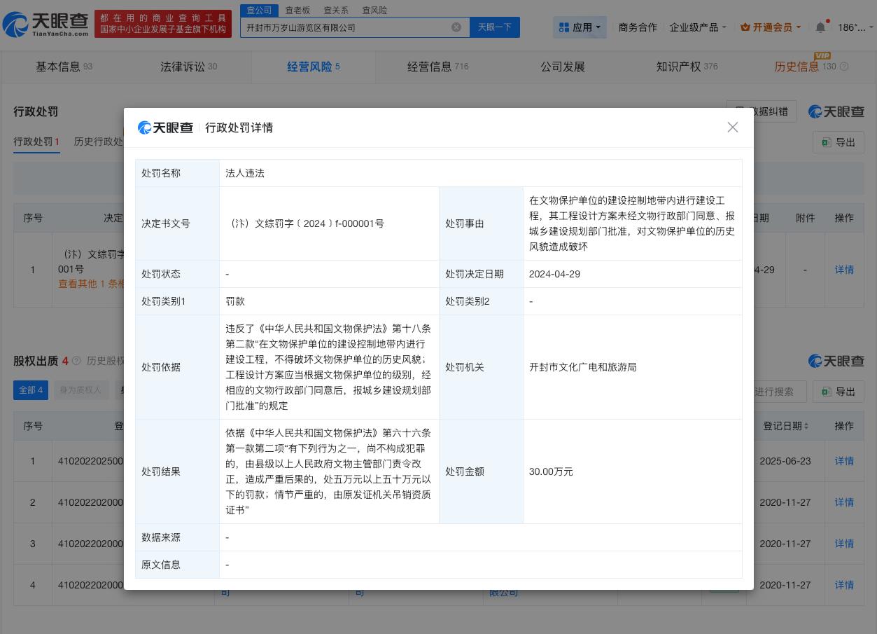 天眼查App显示,万岁山武侠城关联公司开封市万岁山游览区有限公司成立于2004年8月,法定代表人为李隆日,注册资本约1.67亿人民币,经营范围包括游览景区管理、旅游业务、住宿服务等。股东信息显示,该公司由开封市文化旅游股份有限公司、开封仁山文化发展有限责任公司等共同持股。经营风险信息显示,2024年4月,该公司曾因违反《中华人民共和国文物保护法》,被开封市文化广电和旅游局罚款30万元。法律诉讼信息显示,该公司曾因民间借贷纠纷,生命权、健康权、身体权纠纷等被起诉。