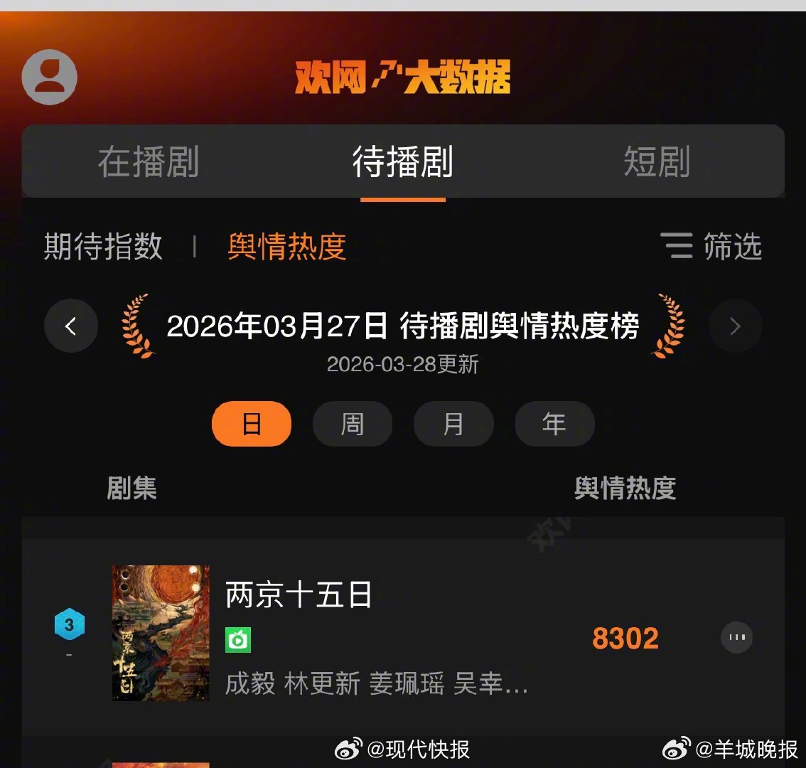 【#成毅两京十五日舆情热度再进TOP3#】3月28日日榜待播剧舆情热度,由演员主