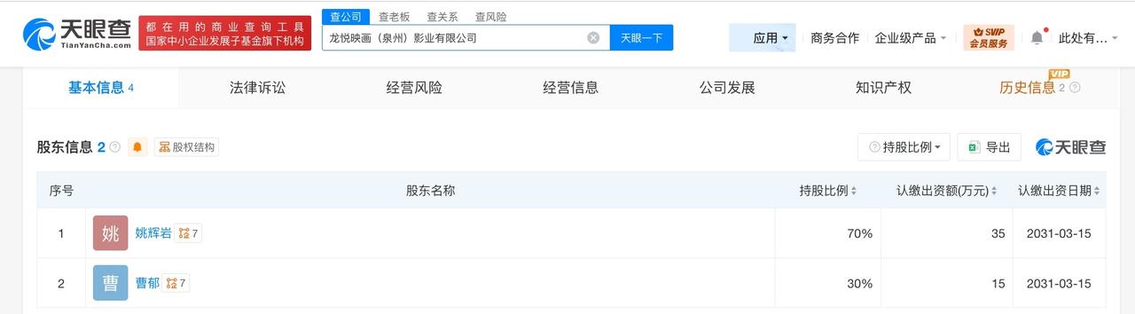 天眼查App显示,近日,龙悦映画(泉州)影业有限公司成立,法定代表人为姚辉岩(姚晨父亲),注册资本50万人民币,经营范围含电影制片、电影摄制服务、组织文化艺术交流活动、礼仪服务、影视美术道具置景服务、文艺创作、文化娱乐经纪人服务等。股东信息显示,该公司由姚辉岩、曹郁分别持股70%、30%。
