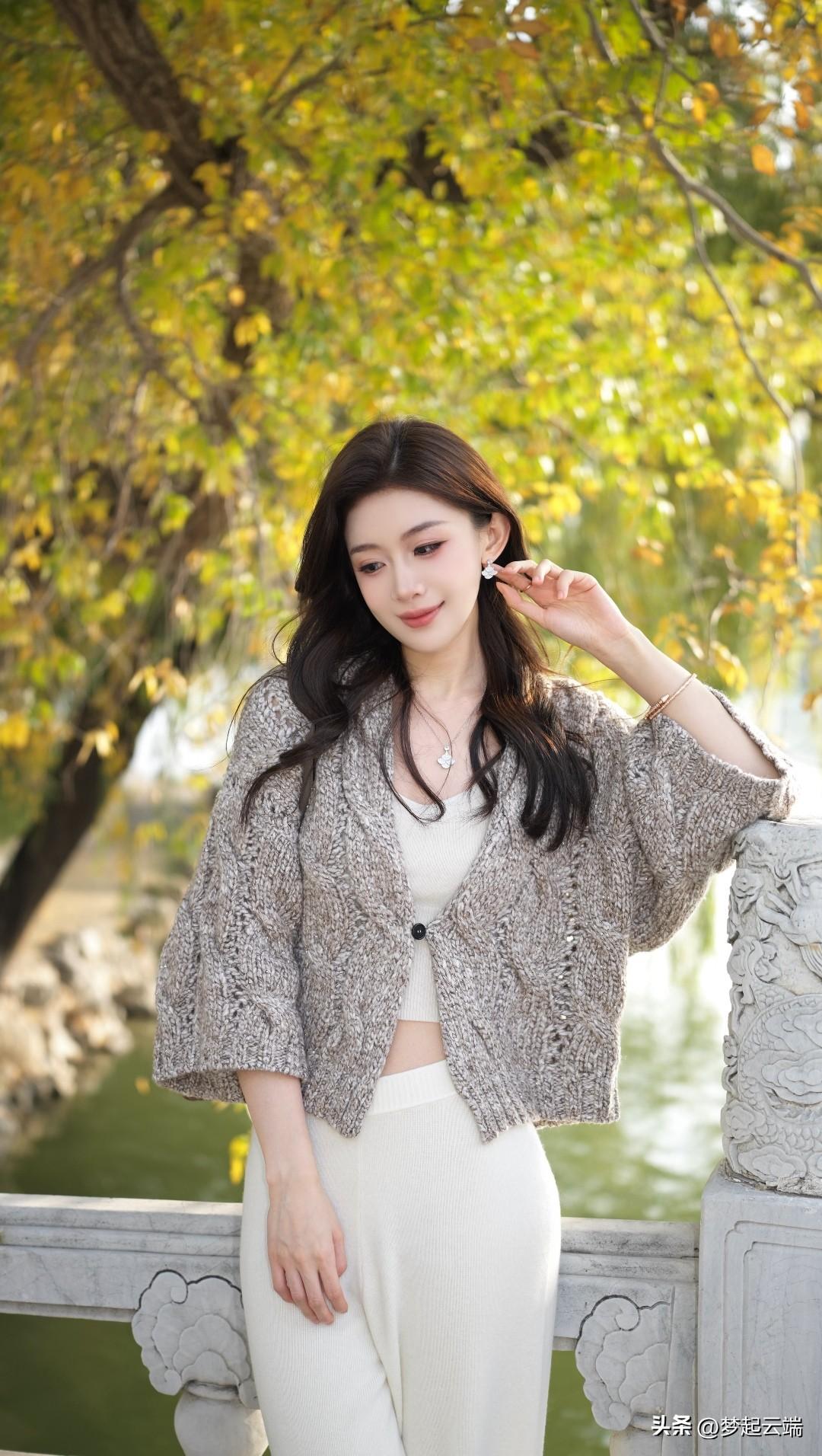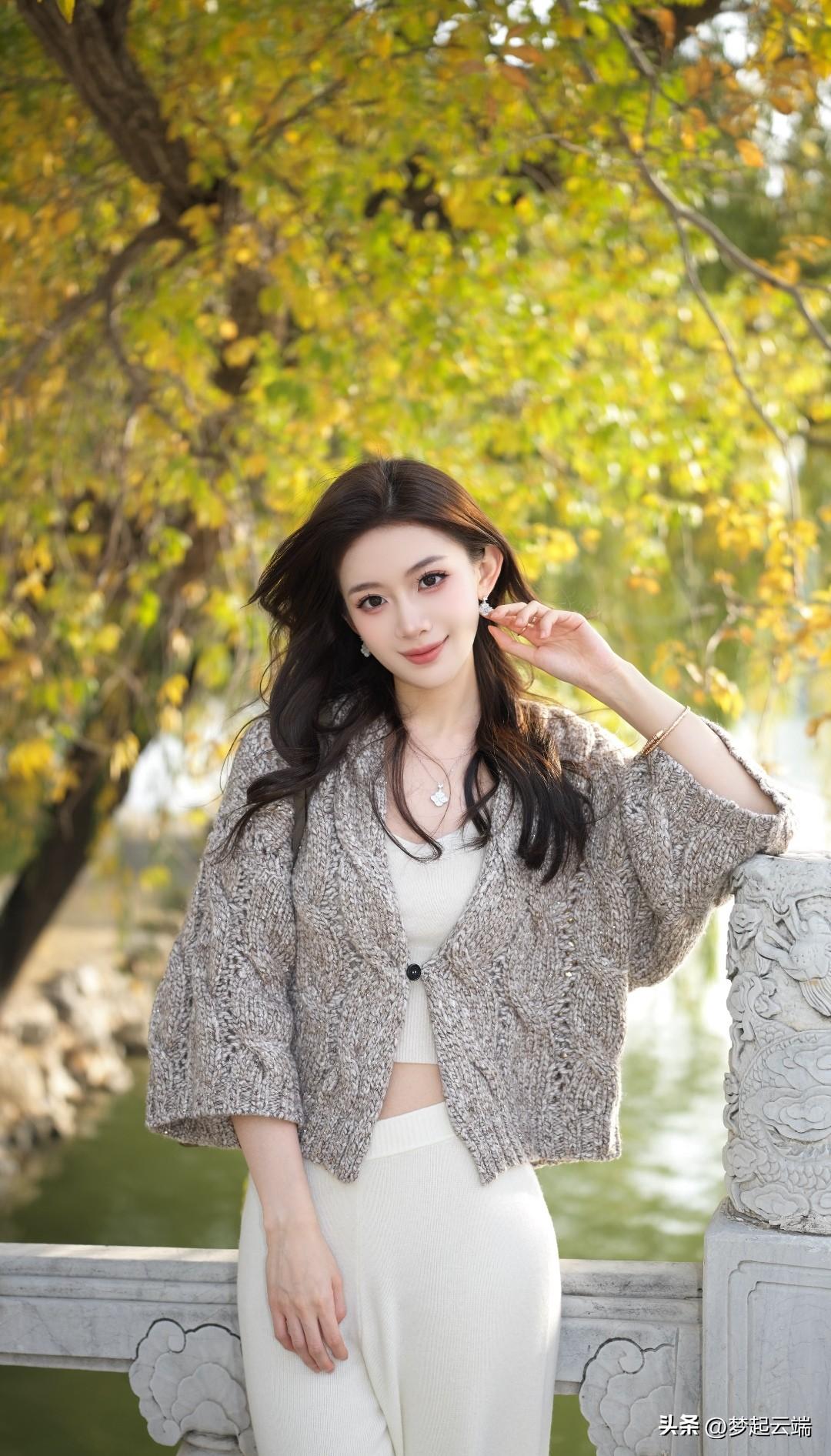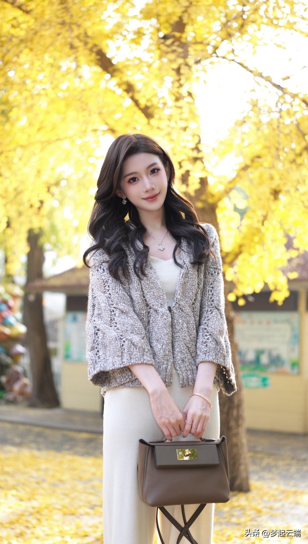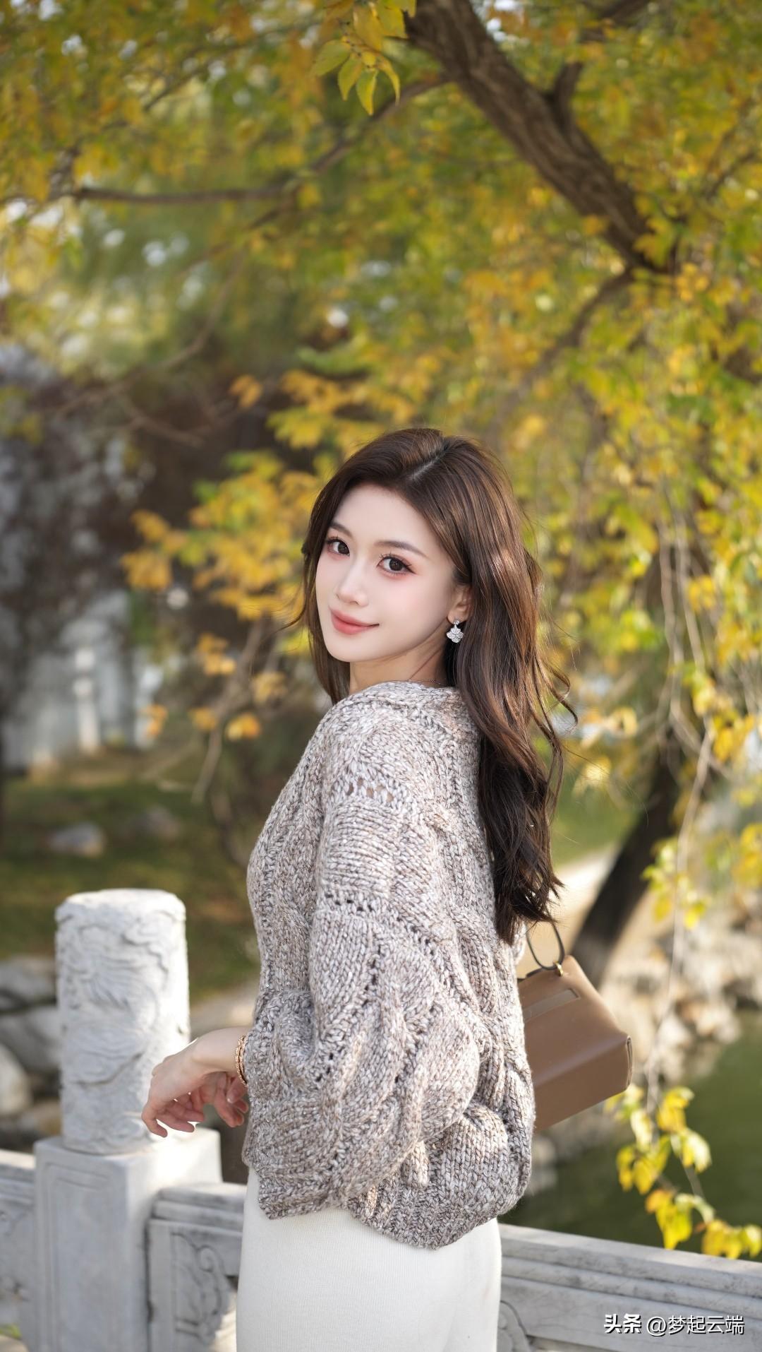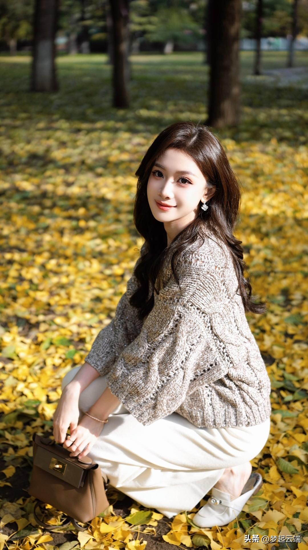 秋日暖阳下,温柔少女漫步在落叶铺满的小径上。
