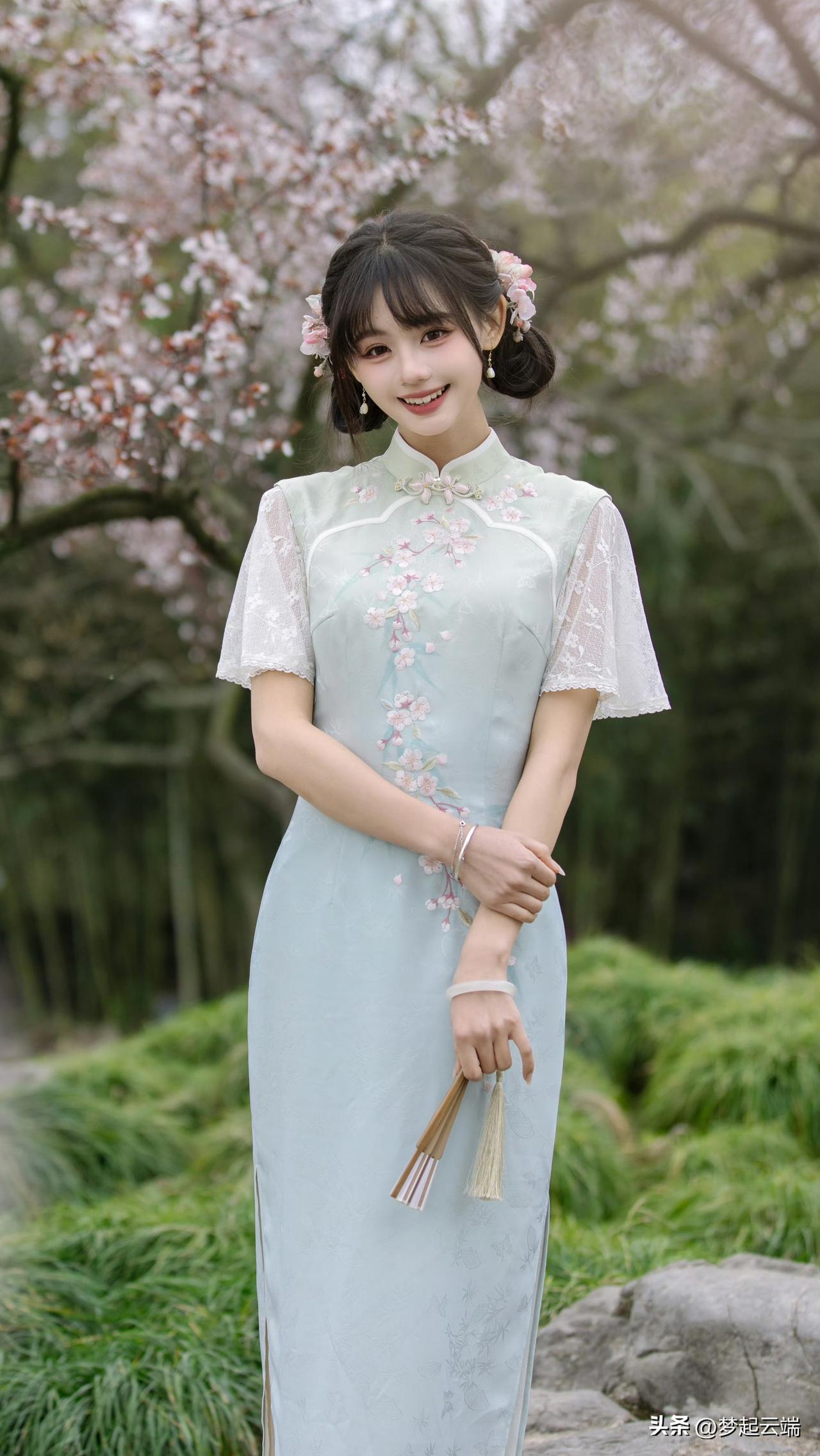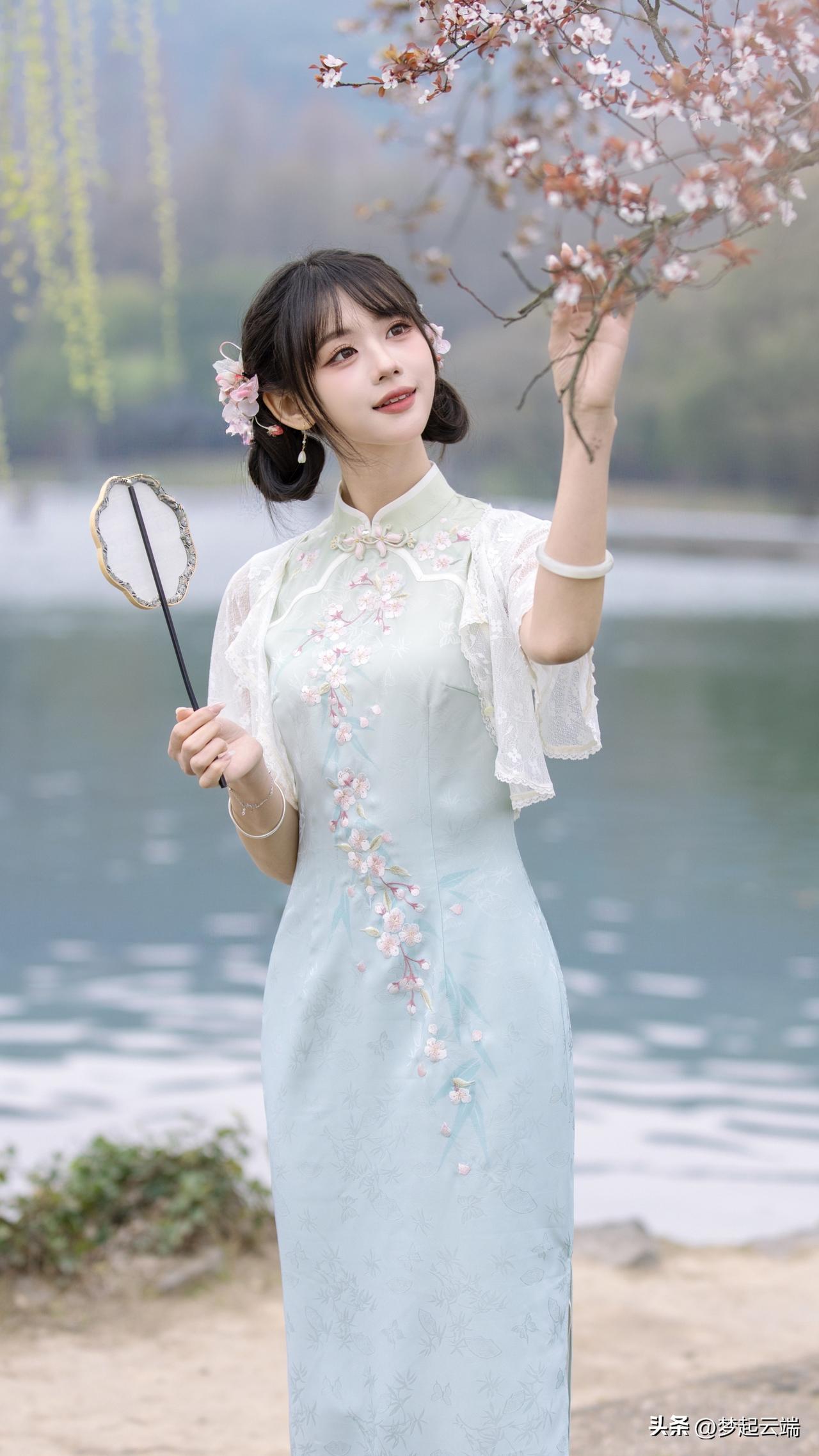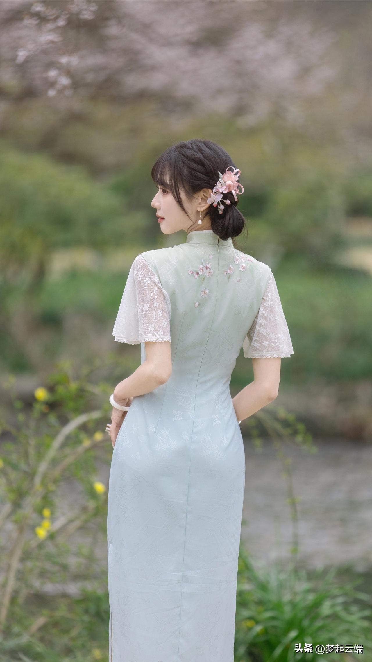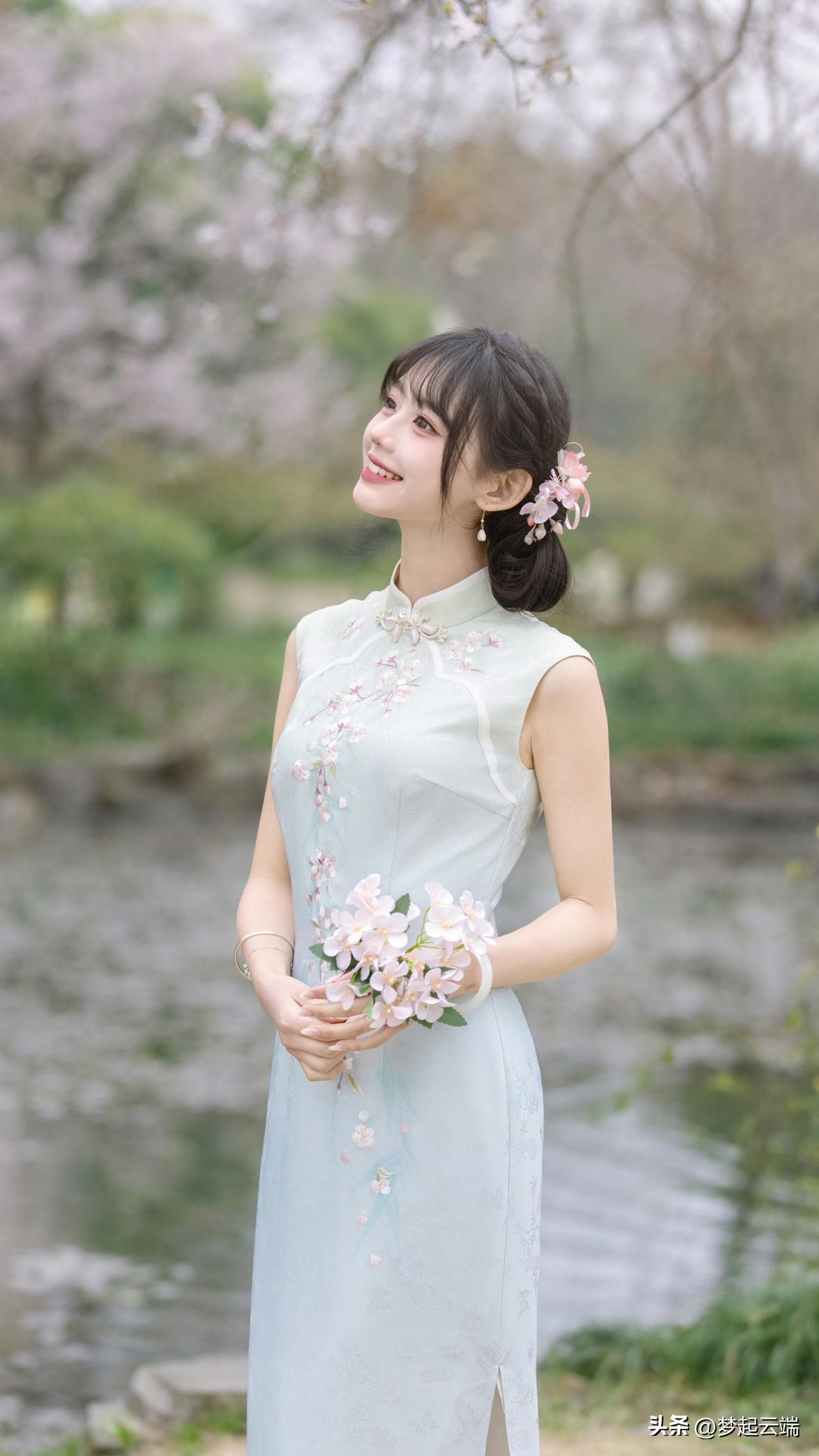春日赏花,轻纱长裙,古风韵味,镜中人影,笑靥如花。