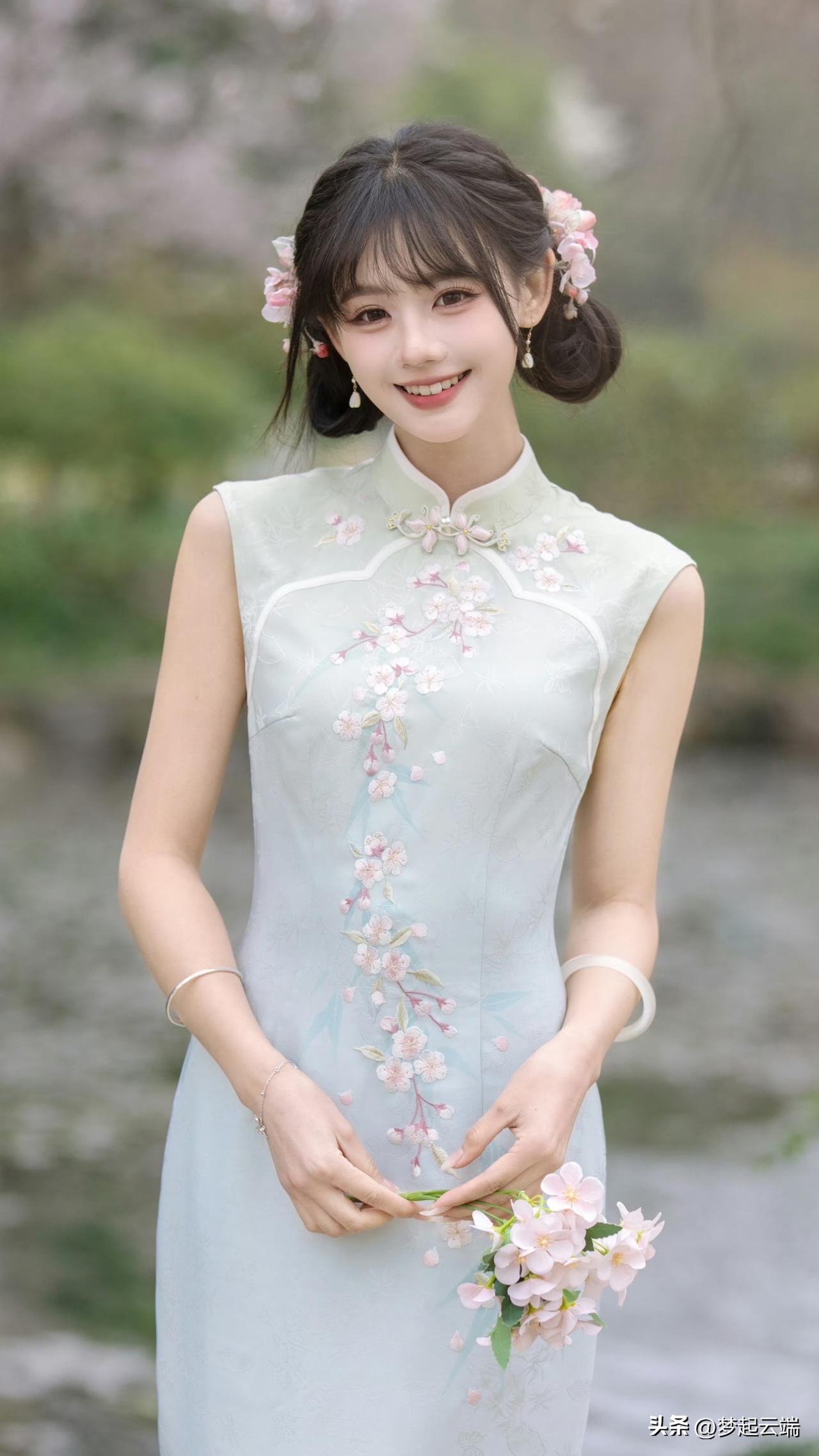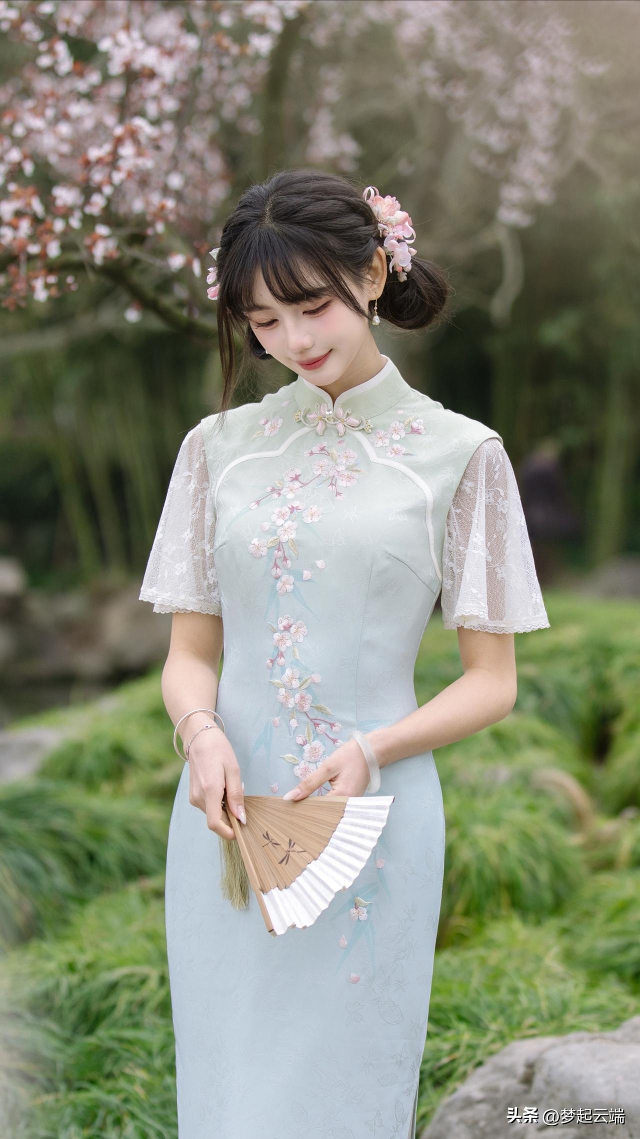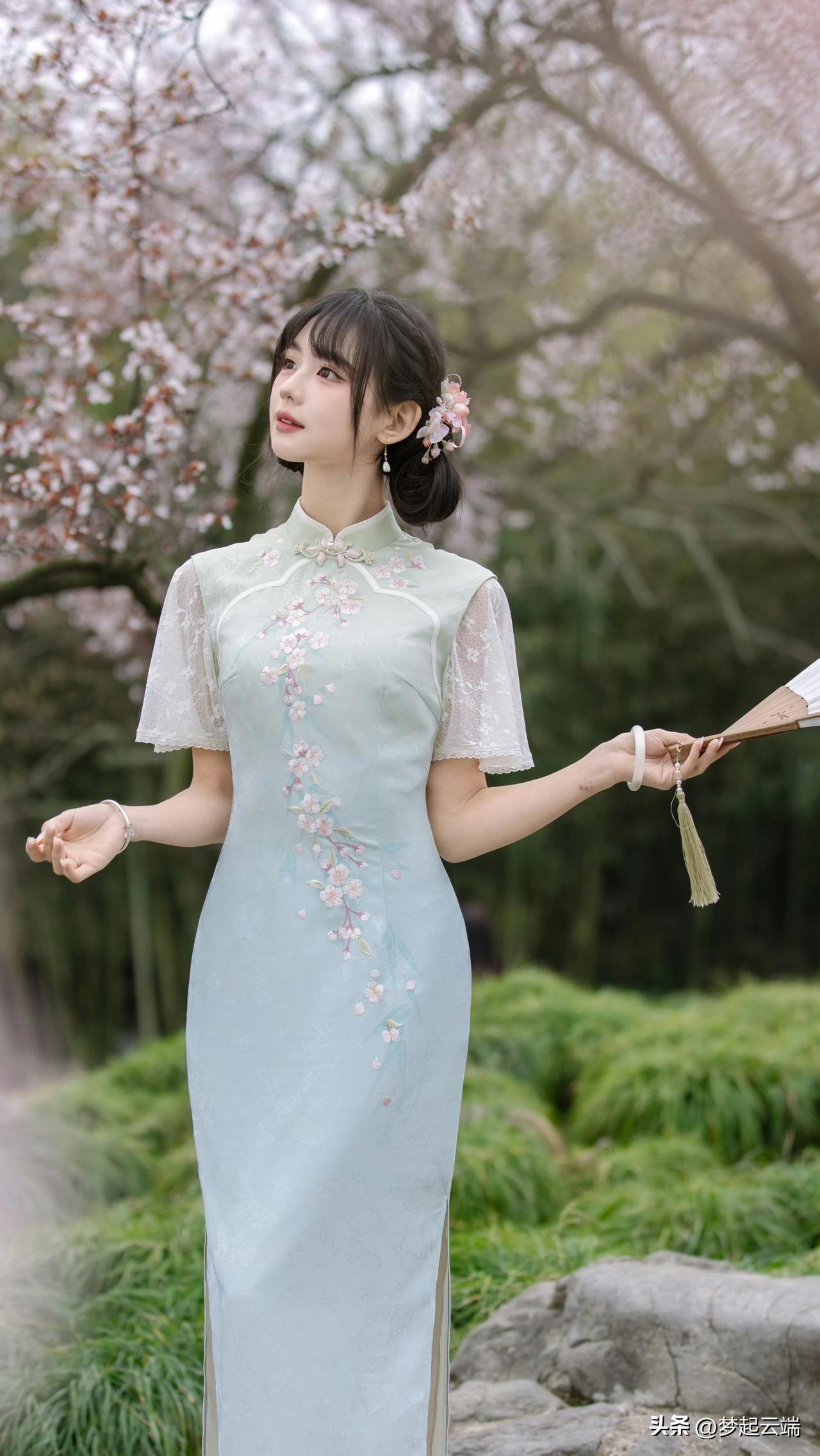 春日赏花,轻纱长裙,古风韵味,镜中人影,笑靥如花。