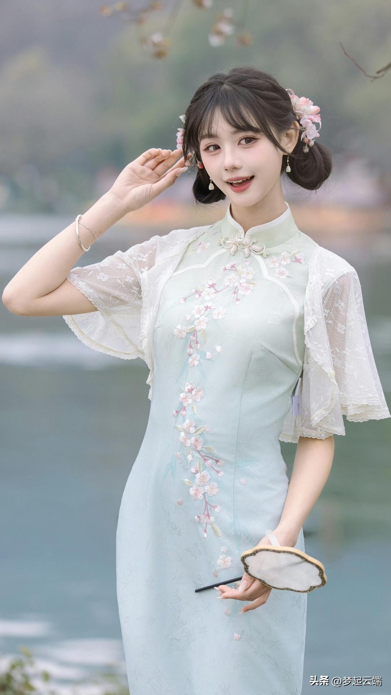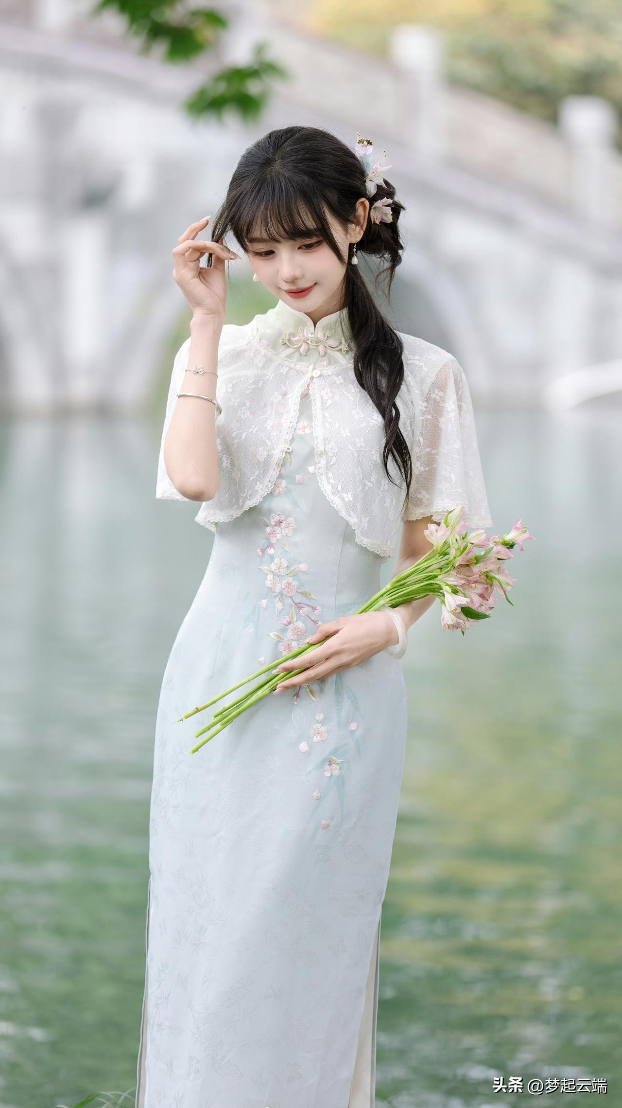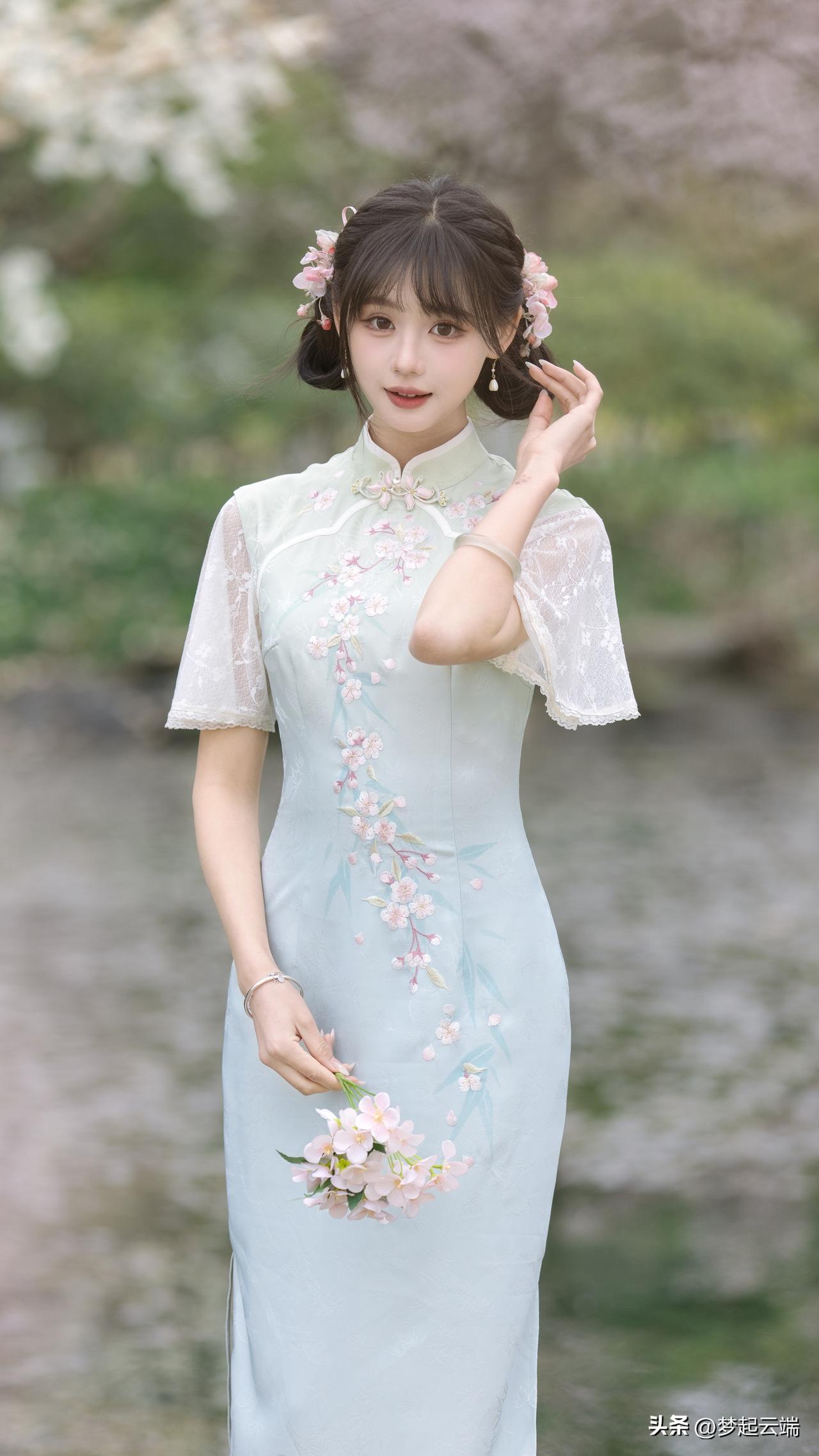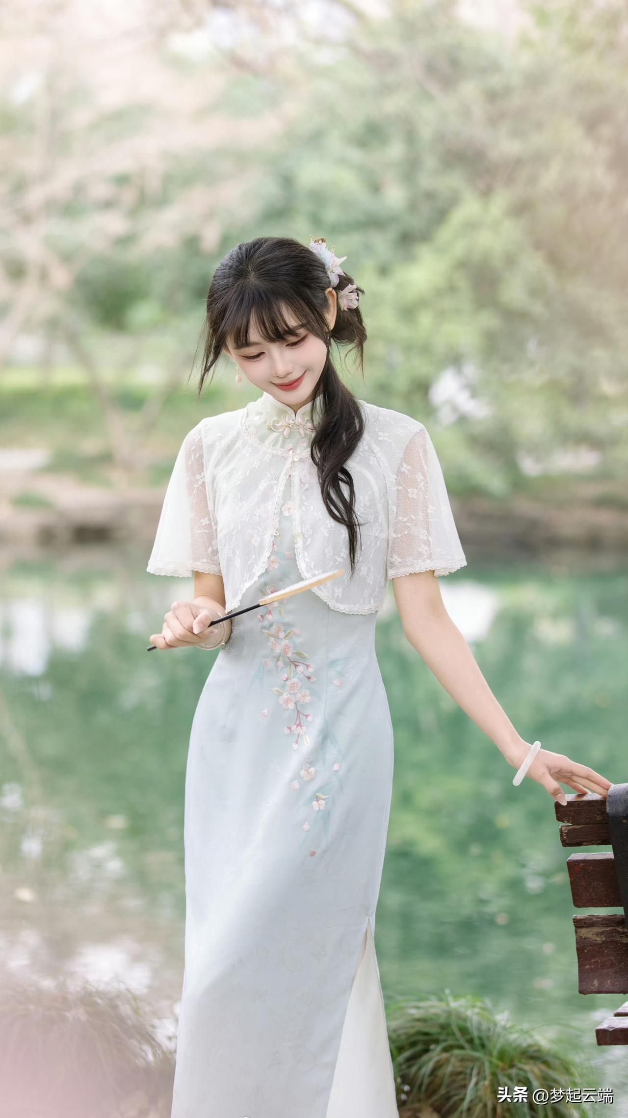 春日赏花,轻纱长裙,古风韵味,镜中人影,笑靥如花。