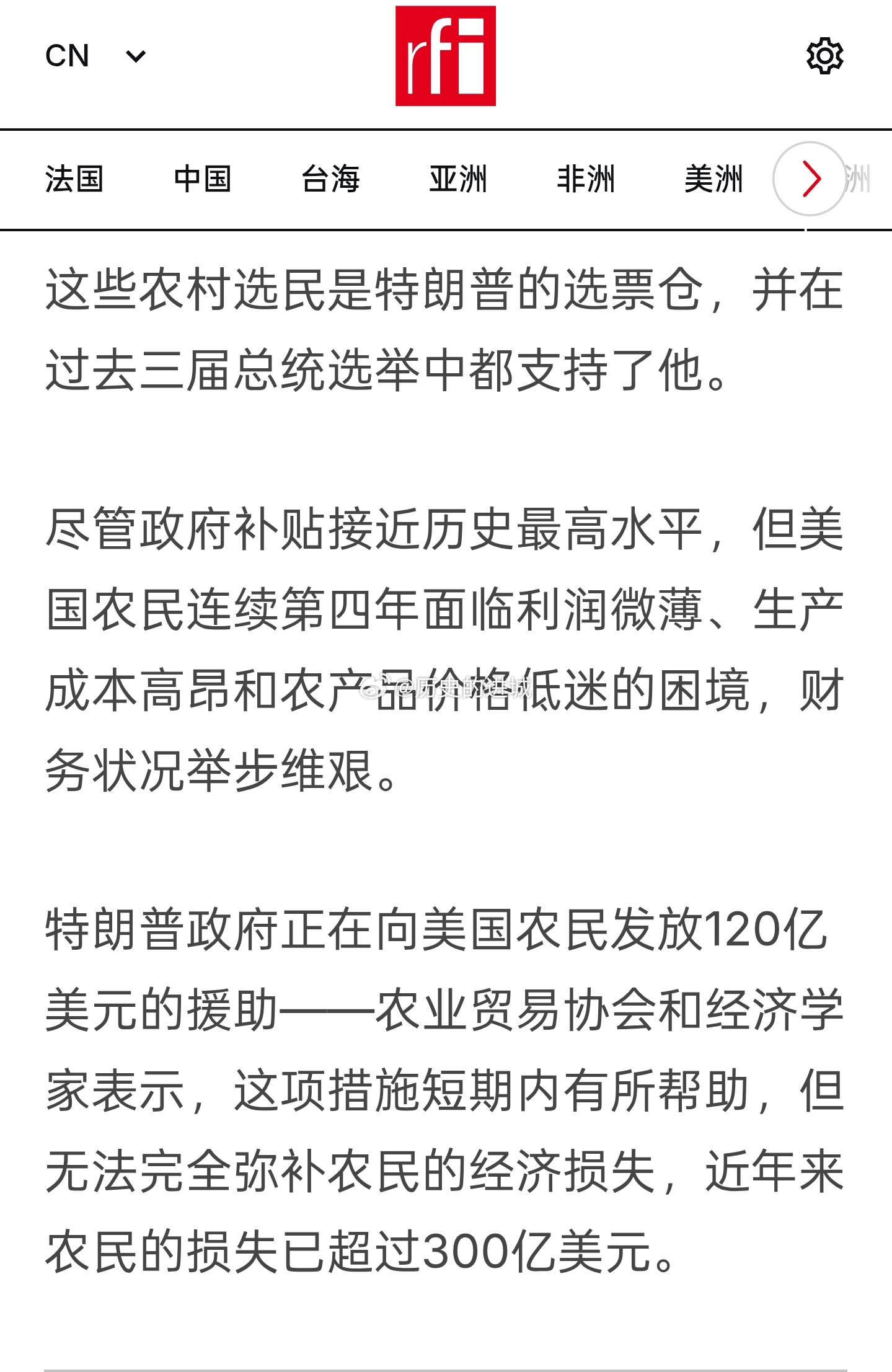特朗普政府正在向美国农民发放120亿美元的援助——农业贸易协会和经济学家表示,这项措施短期内有所帮助,但无法完全弥补农民的经济损失,近年来农民的损失已超过300亿美元。