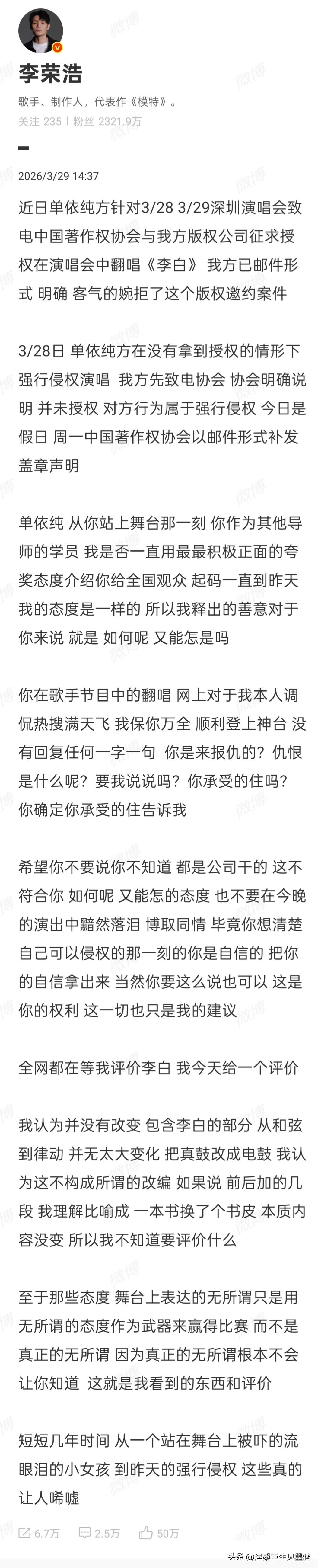 李荣浩发文风波与单依纯:版权争议下的音乐江湖 在2026年3月29日,歌手李荣浩发布的一篇长文,将自己与单依纯的矛盾推向了公众视野,也引发了大众对于音乐版权、艺术创作边界以及艺人成长轨迹等多方面的思考。 一、李荣浩发文的核心诉求与情绪表达 李荣浩在文中首先明确指出了单依纯方在深圳演唱会翻唱其作品《李白》存在版权侵权行为。单依纯方曾就3月28、29日的深圳演唱会翻唱《李白》一事,向中国著作权协会和李荣浩的版权公司征求授权,但李荣浩方以邮件形式明确且客气地婉拒了。然而,3月28日单依纯方在未获得授权的情况下,仍然在演唱会上演唱了《李白》,李荣浩称其行为属于“强行侵权”,并且中国著作权协会在周一(因3月29日为假日)也会以邮件形式补发盖章声明来确认这一侵权事实。 从情绪表达来看,李荣浩的文字中充满了失望与唏嘘。他回顾了自己对单依纯的态度,称从单依纯站上舞台开始,自己一直用最积极正面的夸奖态度向全国观众介绍她,即便在单依纯在《歌手》节目中翻唱《李白》引发网上对自己的调侃、热搜满天飞时,他也选择了沉默,以保全单依纯的声誉,让她能顺利登上“神台”。但如今单依纯的侵权行为,让他觉得自己释出的善意没有得到应有的回应,甚至质疑单依纯是否是“来报仇的”,因为单依纯在《歌手》中的翻唱让自己承受了诸多调侃,而单依纯却没有任何回复。同时,他还对单依纯在《歌手》中对《李白》的改编进行了评价,认为其改编只是把真鼓改成电鼓,前后加的几段内容也只是像“一本书换了个书皮”,本质内容并没有改变,不构成所谓的“改编”,并且觉得单依纯在舞台上表达的“无所谓”态度只是为了赢得比赛的一种手段,而非真正的无所谓。 二、单依纯的行为与形象争议 单依纯作为一名年轻的歌手,近年来在音乐道路上有着不少的表现。她在2020年参加《中国好声音2020》,凭借《永不失联的爱》一战成名并获得年度总冠军,正式踏入演艺圈,之后发行了不少影视歌曲和个人单曲,还在2022年发行了首张专辑《勇敢额度》。在2025年的《歌手2025》节目中,她对李荣浩的《李白》进行了改编,融入了电子国风、游戏梗以及重复念白式歌词等元素,这一改编引发了网友的两极评价,有人觉得充满创意,也有人认为是“毁歌”。而此次在深圳演唱会未经授权翻唱《李白》的行为,更是让她陷入了版权争议的漩涡。 单依纯的行为,一方面让外界质疑她的版权意识,在明知未获得授权的情况下仍然演唱他人作品,这不符合音乐行业对于版权尊重的基本规范;另一方面,也让她过去在大众心中的形象受到了冲击,从一个曾经在舞台上会被吓哭的小女孩,到如今被指责“强行侵权”,这种成长轨迹的变化让李荣浩都觉得“唏嘘”,也让不少关注她的人感到意外。 三、事件背后的行业思考 这一事件不仅仅是李荣浩和单依纯两个人之间的矛盾,也折射出音乐行业存在的一些问题。首先是版权意识的普及与落实,虽然版权相关的法律法规在不断完善,但在实际操作中,仍然有艺人或其团队在版权授权问题上存在侥幸心理,或者对版权的重视程度不够。其次是艺术创作的边界问题,改编他人作品是音乐创作中常见的一种形式,但如何把握改编的“度”,怎样的改编才算是合理且尊重原作的,这需要行业内有更清晰的共识和规范。最后,艺人的成长与口碑维护也至关重要,单依纯作为一名有潜力的年轻歌手,在追求艺术创新和商业演出的同时,更应该注重自身行为的合规性和道德性,否则一旦出现类似的争议事件,多年积累的口碑可能会瞬间崩塌,而李荣浩的遭遇也提醒着其他艺人,在帮助和提携后辈时,也要关注到版权等潜在的风险和问题,避免自己的善意被不当利用。 总之,李荣浩的发文揭开了音乐行业版权与创作领域的一角,也让单依纯的形象面临着重新审视的局面,这一事件或许会成为音乐行业反思和完善相关规范的一个契机。