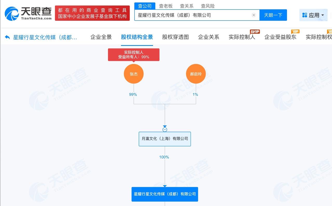 星耀行星文化传媒(成都)有限公司成立于2020年7月,法定代表人为郝启玲,注册资本300万人民币,经营范围含文艺创作与表演、电影和影视节目制作、电影和影视节目发行、录音制作、经营性演出等。股权全景穿透图显示,该公司由月瀛文化(上海)有限公司全资持股,后者由张杰、郝启玲分别持股99%、1%。