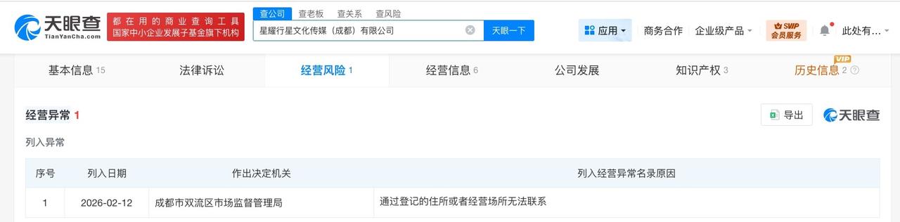 天眼查经营风险信息显示,近期,星耀行星文化传媒(成都)有限公司因通过登记的住所或者经营场所无法联系,被成都市双流区市场监督管理局列入经营异常名录。