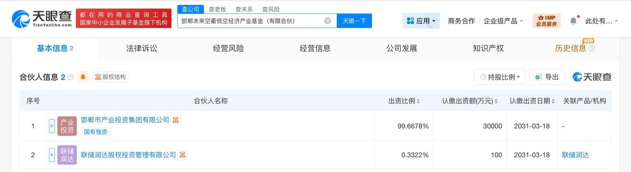 天眼查工商信息显示,近日,邯郸未来空衢低空经济产业基金(有限合伙)成立,执行事务合伙人为联储润达股权投资管理有限公司,出资额约3亿人民币,经营范围为以私募基金从事股权投资、投资管理、资产管理等活动,创业投资。合伙人信息显示,该基金由邯郸市产业投资集团有限公司、联储润达股权投资管理有限公司共同出资。