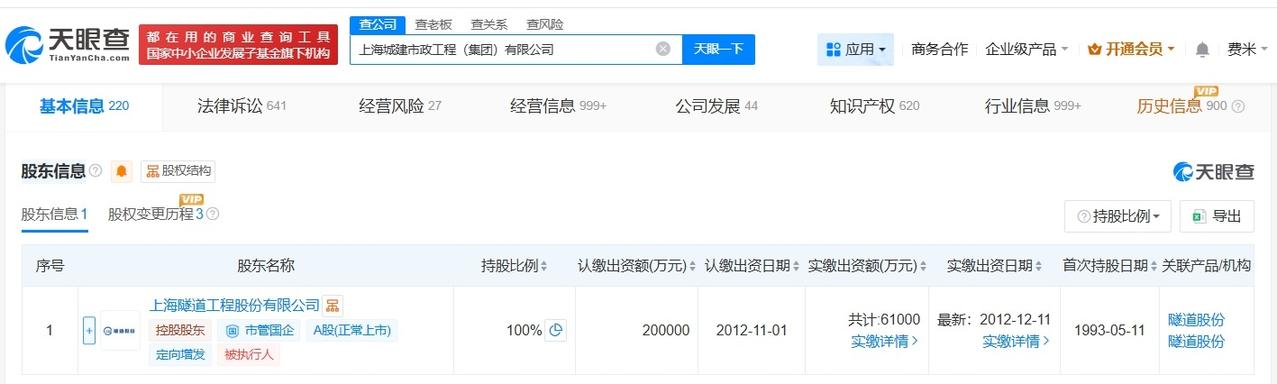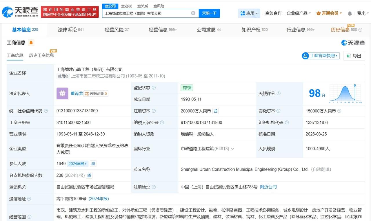 天眼查App显示,近日,上海城建市政工程(集团)有限公司发生工商变更,注册资本由15亿人民币增至20亿人民币,增幅约33%。