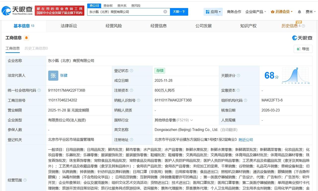 该公司成立于2025年11月,注册资本800万人民币,经营范围包括日用品销售、食品销售、互联网销售、餐饮服务等,由新东方旗下珠海崇胜合力网络科技有限公司全资持股。