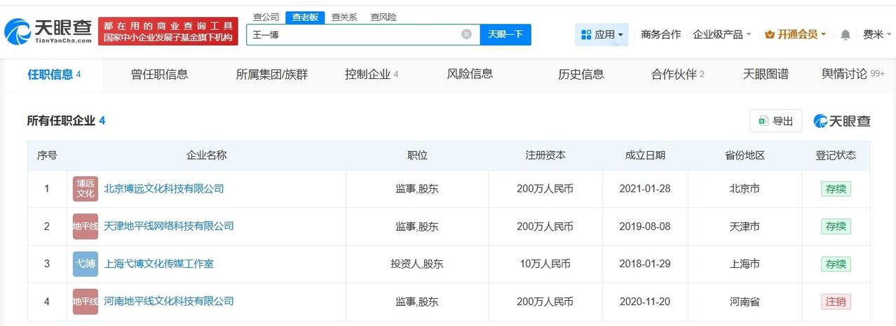 天眼查App显示,王一博名下关联4家企业,其中3家企业处于存续状态,分别是北京博远文化科技有限公司、天津地平线网络科技有限公司、上海弋博文化传媒工作室,王一博在上述企业持有股份或者担任监事。值得一提的是,天津地平线网络科技有限公司已成功注册多枚“王一博”商标,国际分类包括乐器、食品、运输工具等。
