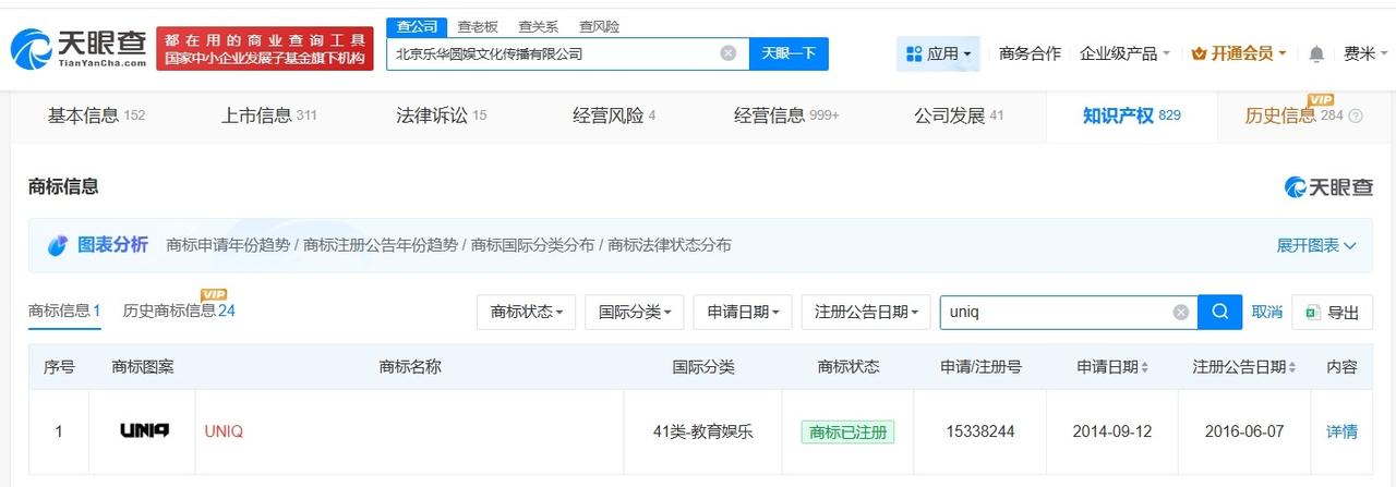 此外,乐华娱乐关联公司北京乐华圆娱文化传播有限公司已注册“UNIQ”商标,国际分类为教育娱乐。公开资料显示,UNIQ是乐华娱乐于2014年推出的中韩跨国男子流行演唱组合,王一博是该组合成员之一,目前该组合已解散。