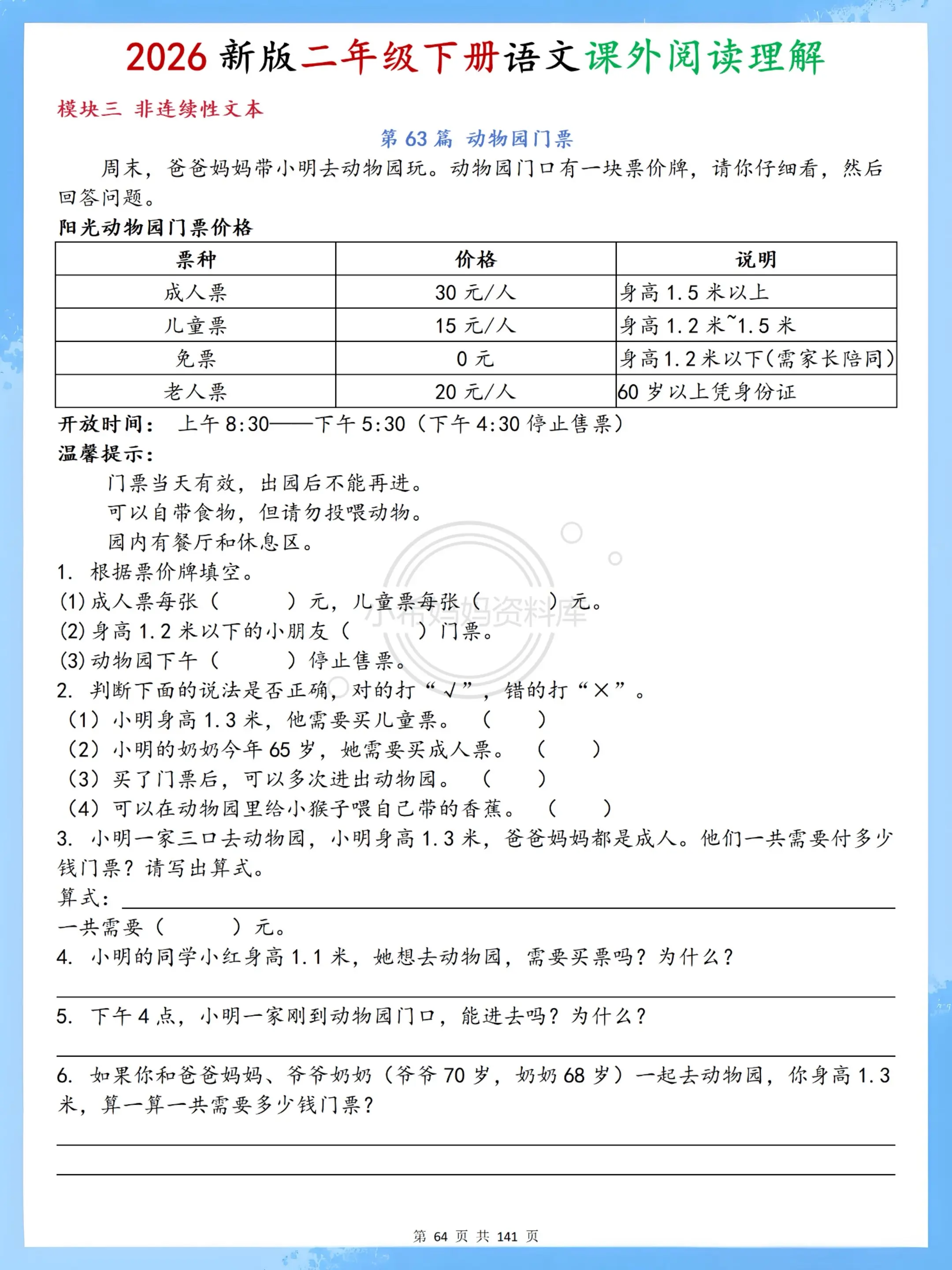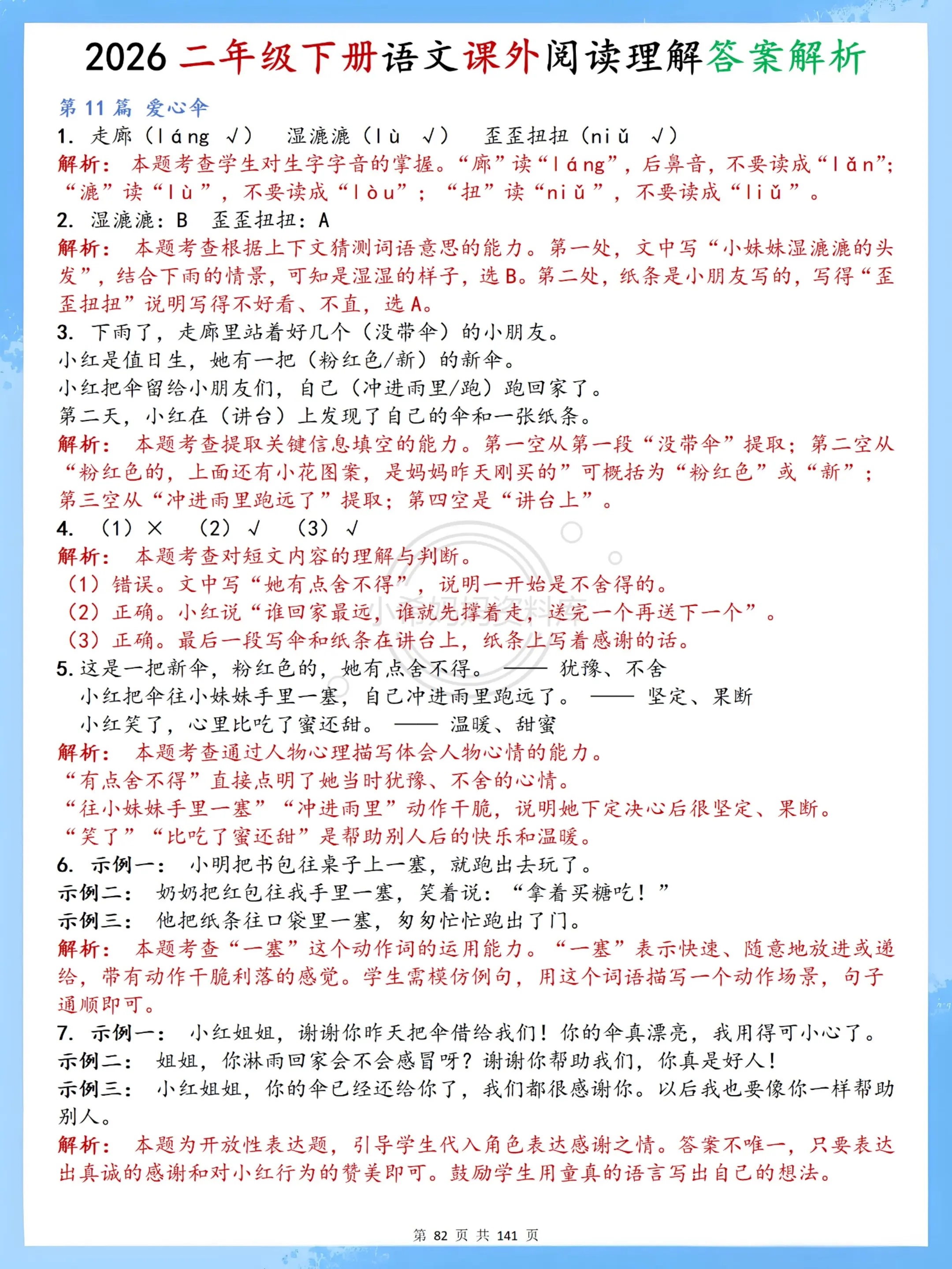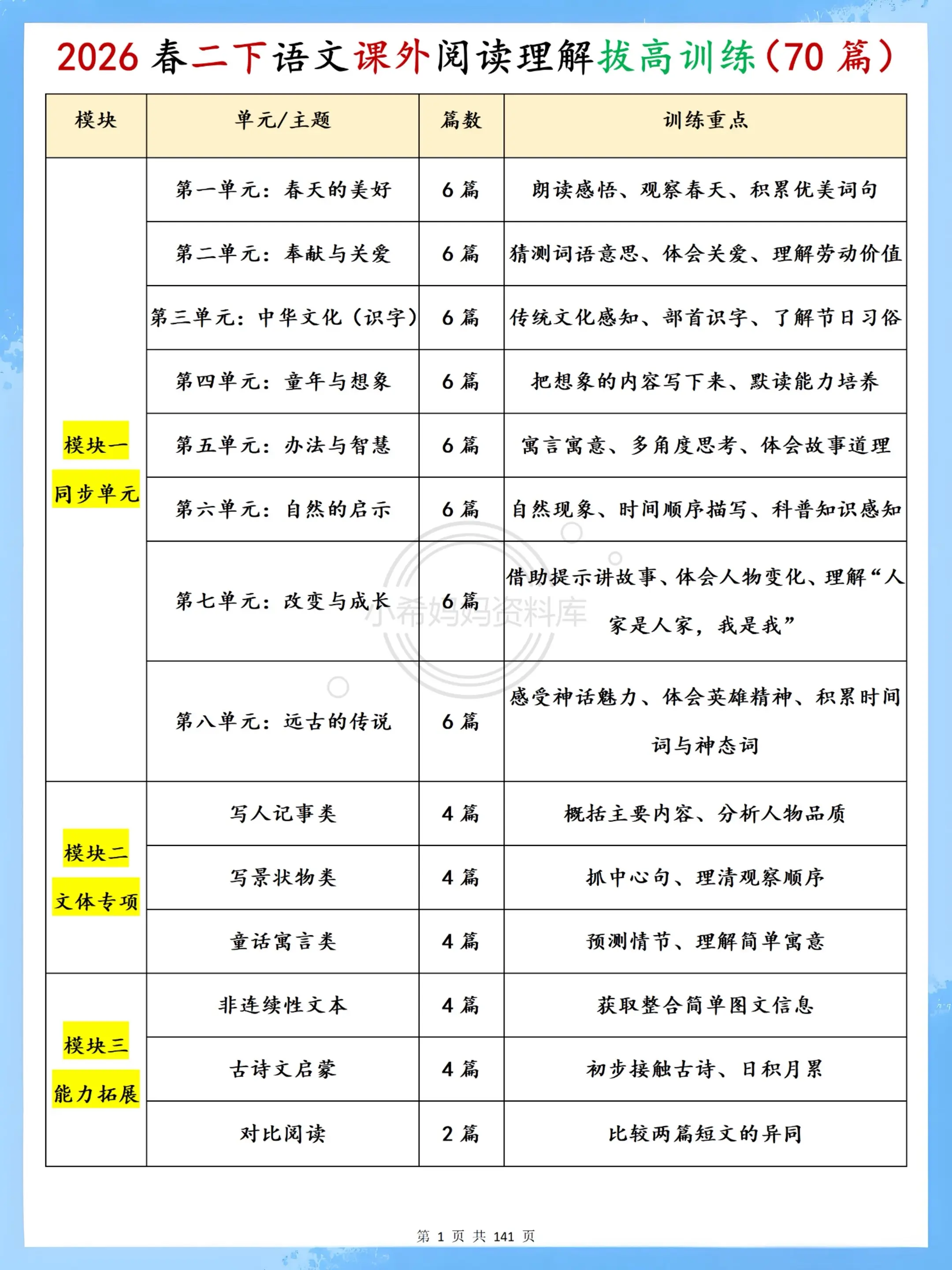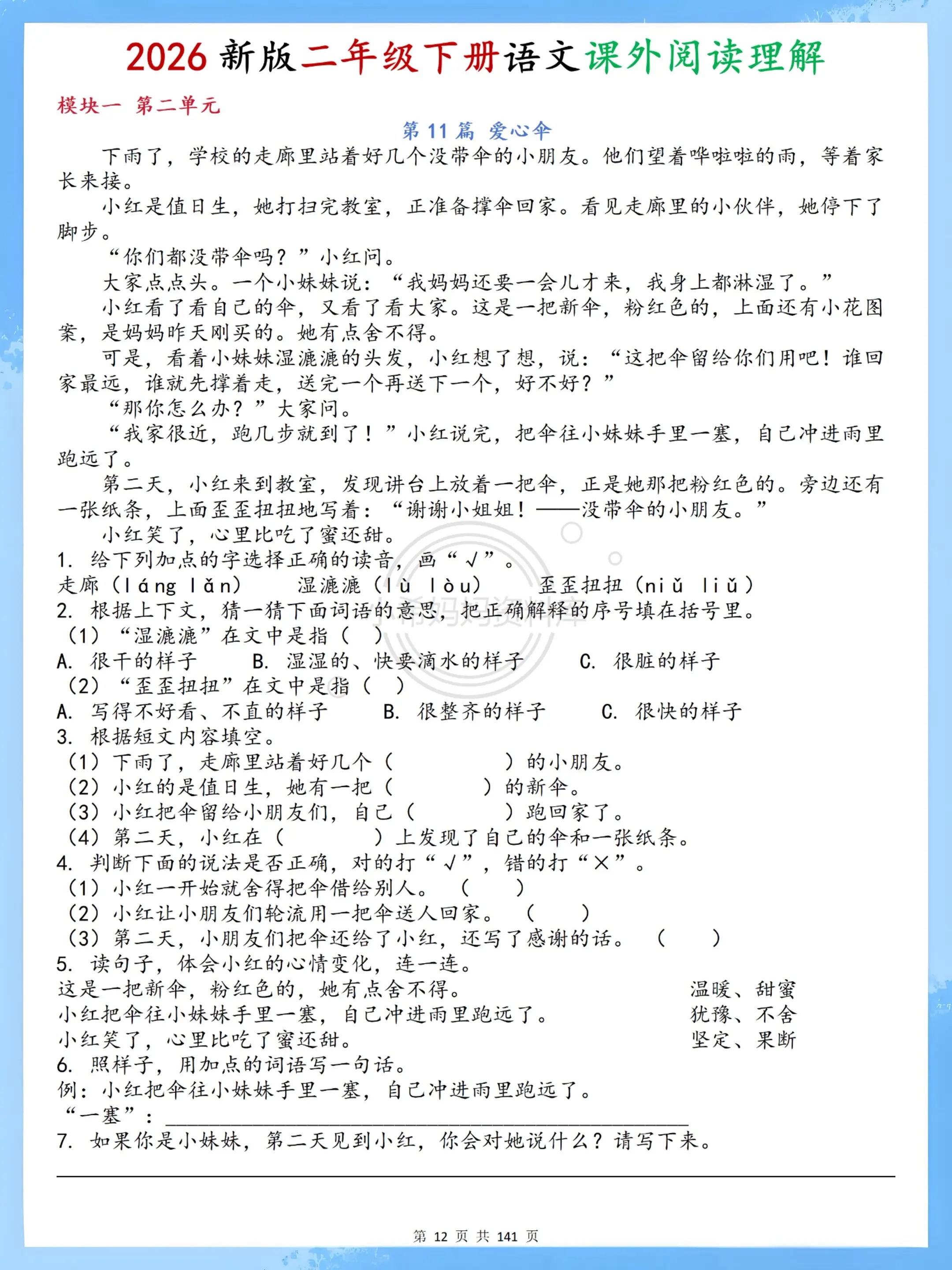 二年级下册语文阅读轻松练|70篇贴合课本。家有二年级娃的宝妈看过来!这款阅读理解实在太懂啦~ 70篇题目全适配2026新版课本,分模块覆盖春天写景、童话寓言、神话古诗、非连续性文本等课内重点,每篇篇幅短小精悍,10分钟就能轻松完成,不给孩子额外负担。 每篇都附清晰答案解析,字音字词、句式理解、中心思想都讲得明明白白,孩子能自主核对、慢慢领悟,不用家长逐题辅导。题目难度贴合课内进度,不超纲、不施压,既能巩固课堂知识,又能悄悄培养阅读兴趣,让孩子在轻松积累中提升理解能力~