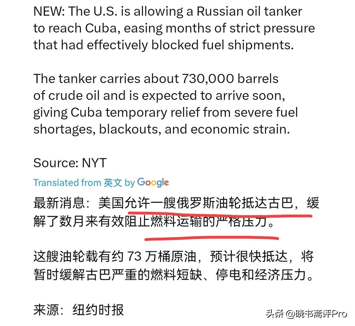 俄罗斯的微操简直可以打一百分!美国允许一艘俄罗斯油轮驶往古巴,结果俄罗斯专门挑了一艘在美国制裁名单上的油轮去给古巴送油,俄罗斯这真的是把美国治的透透的。3月30日,纽约时报表示,美国已允许一艘俄罗斯油轮驶往古巴,此举放松了持续数月的严格施压——此前美方的限制实际上已阻断了对古巴的燃油运输。 很显然,美国对古巴能源封锁极不光彩,这几乎要造成古巴国内的人道主义灾难。如果美国不放行,这就会彻底坐实美国是一个“反人道”的国家。因此,在重压之下,美国这才不得不松了口子。结果美国刚一放行,美国才明白过来,去给古巴送油的俄罗斯油轮,恰好就在美国的制裁名单之上。 无疑,俄罗斯这是给美国出了一个难题。如果美国拦截,不仅会冒与俄罗斯军事对抗升级的风险,还会坐实美国制造古巴人道主义危机。因为该船是俄罗斯国资所有,任何对俄油船的拦截,如登检,扣押都将被视为敌对行为或军事挑衅。而如果不拦截,就等于公开承认制裁失效,美国对俄、对古的双重封锁将被撕开一个口子。 俄罗斯用黑名单油轮大摇大摆开过去,就是在当众宣告,美国的制裁形同虚设,这当然对美国是一个巨大的刺激,更是给古巴巨大的信心。俄罗斯当然是看准了此时此刻,美国不敢硬碰硬。当然,现在美国已经不得不放行。问题是,既然被美国制裁的油轮都可以向古巴运油,那正常的与古巴的石油贸易又有什么不可以呢?显然,美国的霸权威慑正在持续松动。