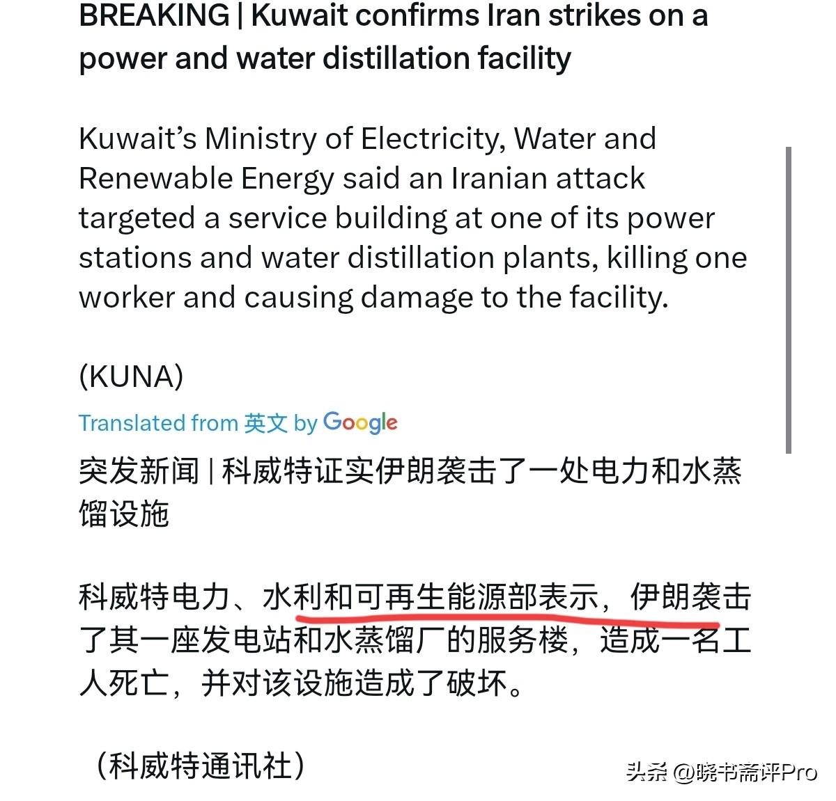 科威特麻烦大了!伊朗说到做到,伊朗真打海水淡化设施了!3月30日,根据科威特通讯社报道,科威特证实伊朗袭击了一处电力和海水淡化设施,袭击造成一名工人死亡,设施受损。很显然,美国和以色列刚动手炸伊朗本土电力、能源及海水淡化厂,没想到伊朗的反击来的这么快。 伊朗的出手打击,这当然是告诉美国及盟友,伊朗严格兑现“对等反制”,绝无虚言。但正在科威特的角度而言,麻烦就大了。事实上,科威特90%以上淡水靠海水淡化,且多是电站与水厂一体,也就是水电联产。而科威特淡水储备仅有3–7天。如果相关设施受损严重,恐怕科威特医院、居民、工业用水都会出现大问题。 这对于科威特当然是非常的致命,这还不包括可能的停电影响。并且,伊朗此例一开,沙特,阿联酋,巴林等高度依赖海水淡化的国家,心里面不慌吗?不担心自己成为下一个目标吗?这些设施如果被炸毁,可不是一天两天能够恢复的。显然,伊朗这是倒逼这些国家必须与美国进行切割。一句话,要么这些国家扛下冲突升级的代价,要么与美国保持距离。显然,伊朗的刀已经架到脖子上了。