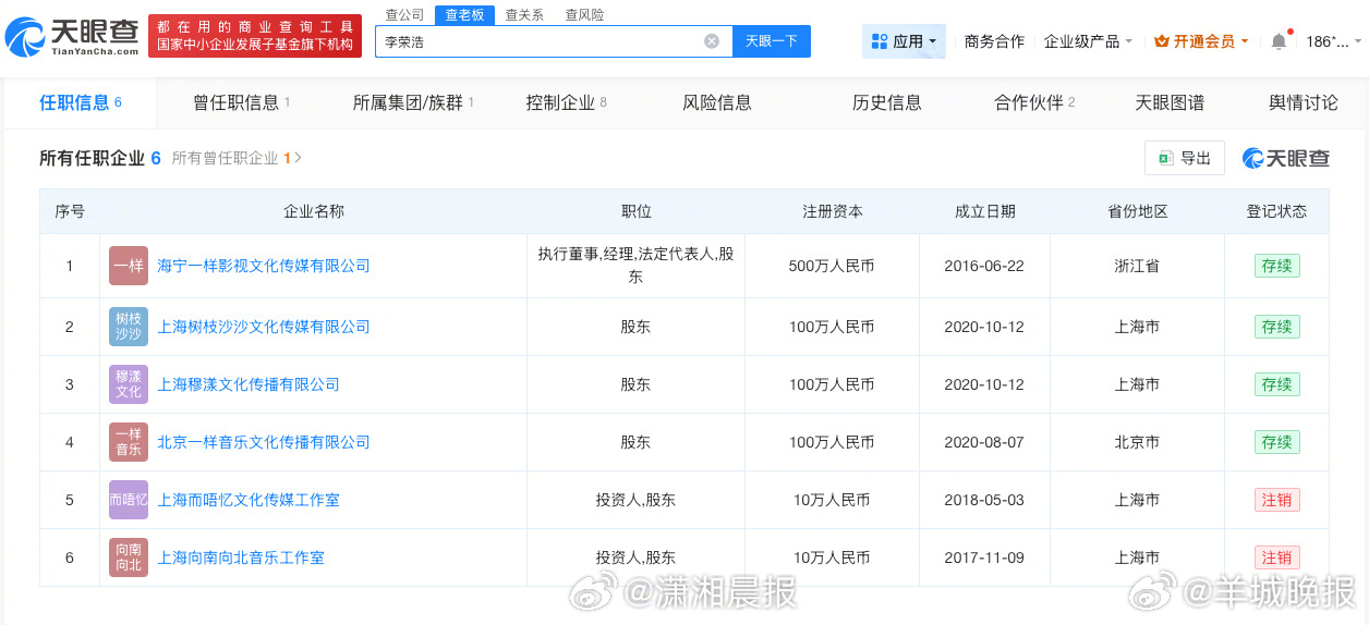 记者查询天眼查任职信息发现,李荣浩名下关联6家企业,其中4家处于存续状态,包括海宁一样影视文化传媒有限公司、上海树枝沙沙文化传媒有限公司、上海穆漾文化传播有限公司、北京一样音乐文化传播有限公司,李荣浩在上述企业担任法定代表人、执行董事等职务。(潇湘晨报)更多消息:#李荣浩说不需要赔偿##永不失联的爱原唱是周兴哲##李荣浩 中译中##单依纯承担全额版权使用费及赔偿##单依纯发长文回应##李荣浩 格局#(编辑:惠天骄;审签:艾渝)