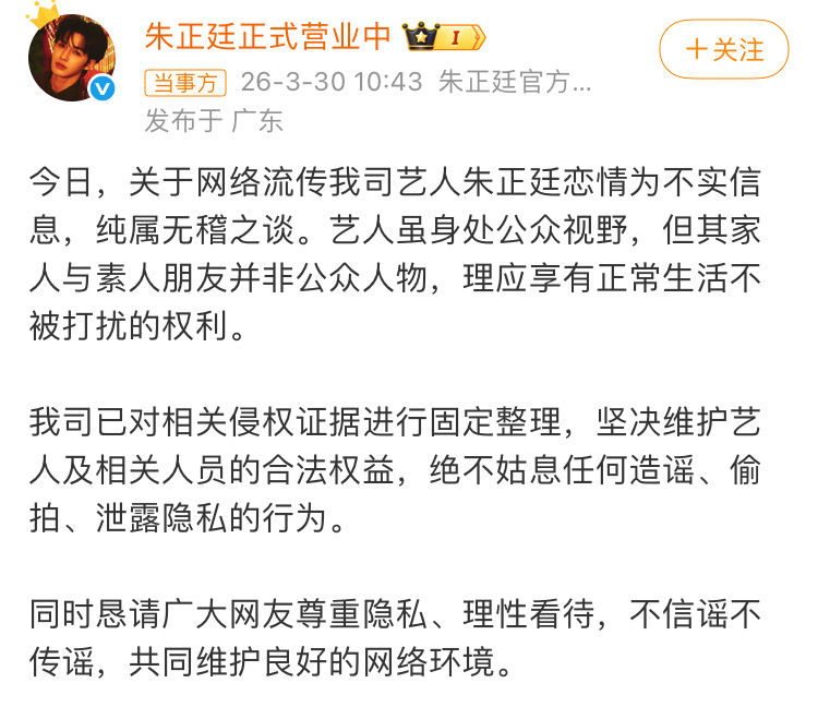 疑似朱正廷恋情曝光有八卦媒体拍到朱正廷带一神秘美女看新房,次日还与父母商量装修规划,现朱正廷方已回应称网传恋情为不实消息,纯属无稽之谈,还是好好关注帅哥作品吧!