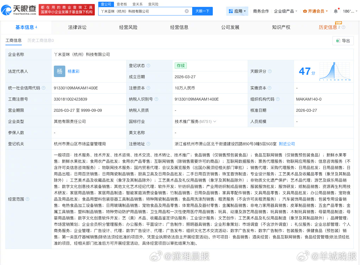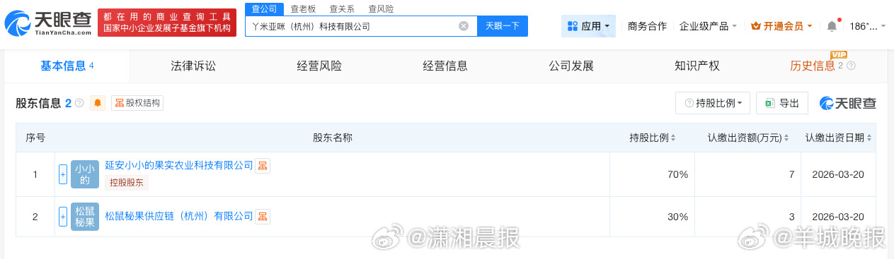 【#赵露思助农品牌成立新公司#】 记者查询天眼查发现,近日,丫米亚咪(杭州)科技有限公司成立,法定代表人为杨素彩,注册资本10万人民币,经营范围包括食品销售、食用农产品批发、食用农产品零售、互联网销售、品牌管理、市场营销策划等,由“Aaaaapple”关联公司延安小小的果实农业科技有限公司、松鼠秘果供应链(杭州)有限公司分别持股70%、30%。(潇湘晨报)更多消息:#李荣浩说不需要赔偿##李荣浩 中译中##永不失联的爱原唱是周兴哲##单依纯承担全额版权使用费及赔偿##李荣浩 格局##陈奕迅睡着了##赵露思助农品牌投资成立新公司#(编辑:惠天骄;审签:艾渝)
