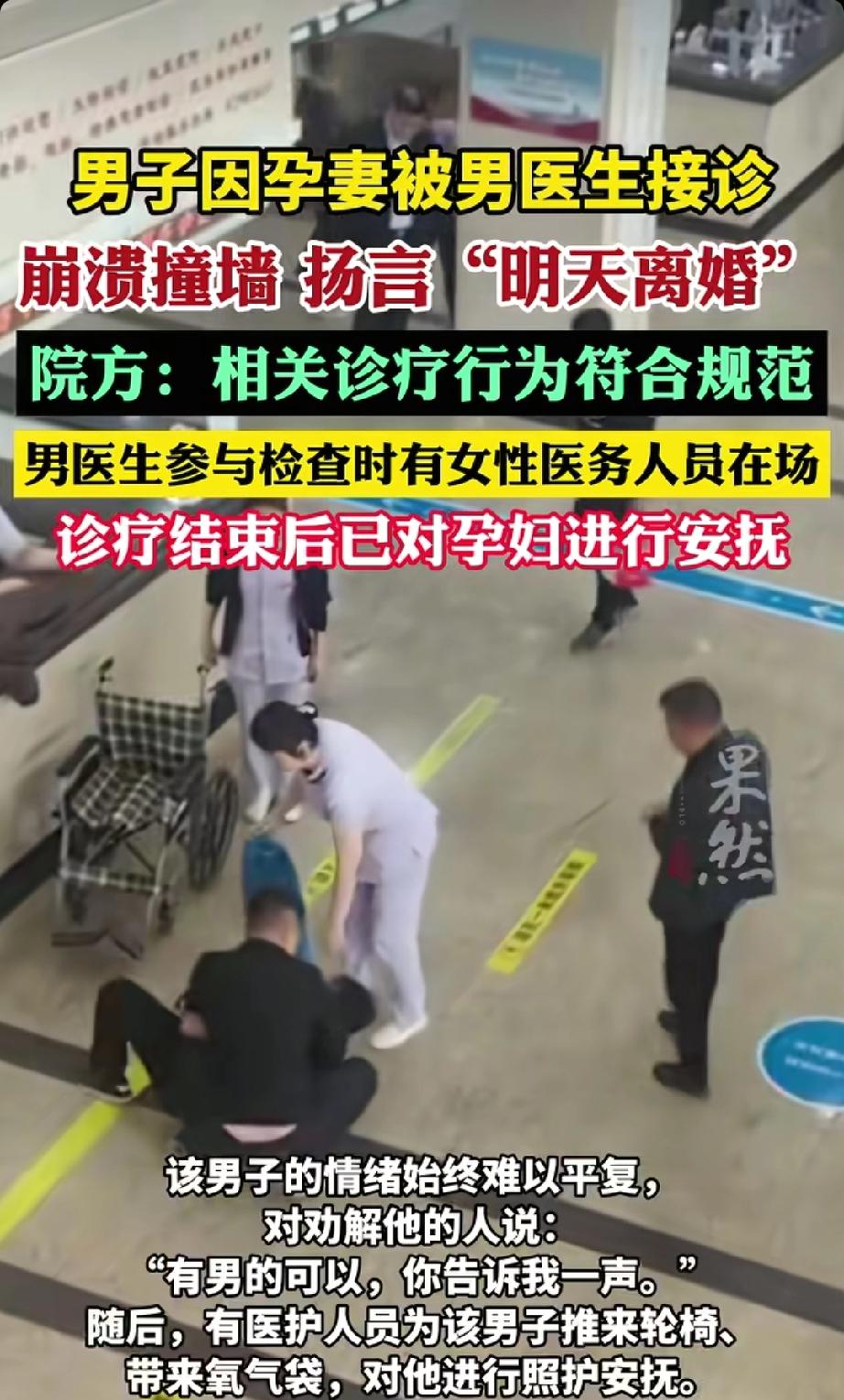 近日,吉林长春一男子陪孕妻做彩超,得知是男医生后竟情绪崩溃撞墙,还扬言“明天离婚”。这一幕发生在医院大厅,男子大喊“让人看了,不过了”,挣脱劝阻后朝墙撞去,倒地还喊着“不活了”。