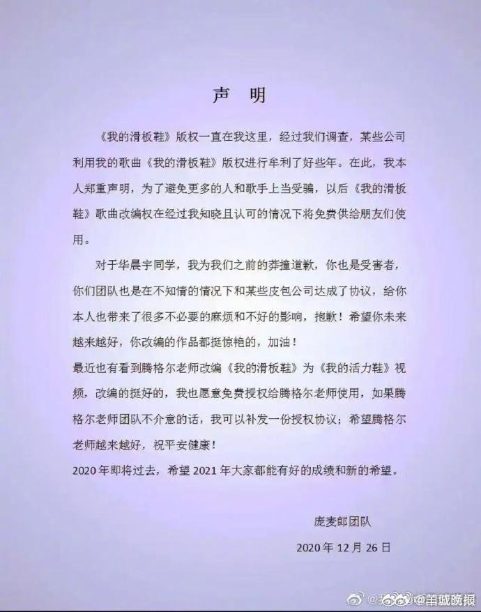 【#华晨宇工作室曾多次发声明#】3月30日,#庞麦郎 华晨宇#单依纯承担全额版权