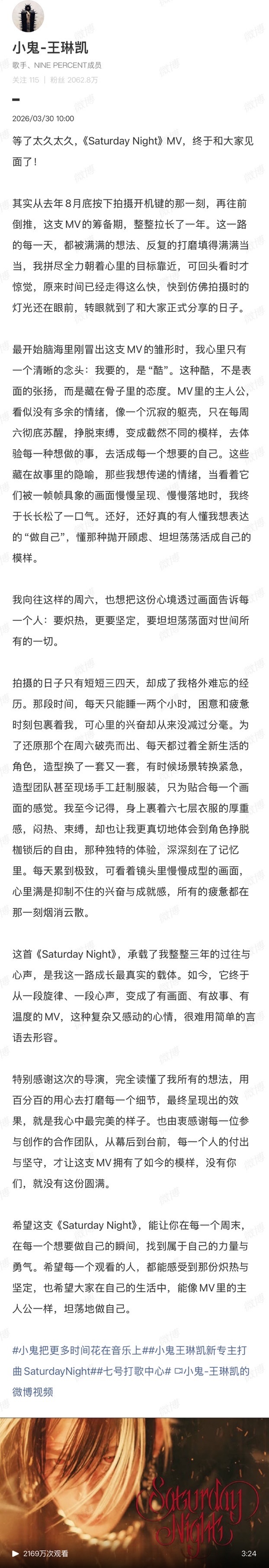 小鬼说没有你们就没有这份圆满从旋律到画面,《Saturday Night》MV是小鬼成长的真实载体。熬夜赶工、反复打磨,他说“没有你们就没有这份圆满”,是对创作团队最真诚的致谢,也是对音乐最炽热的坚守!