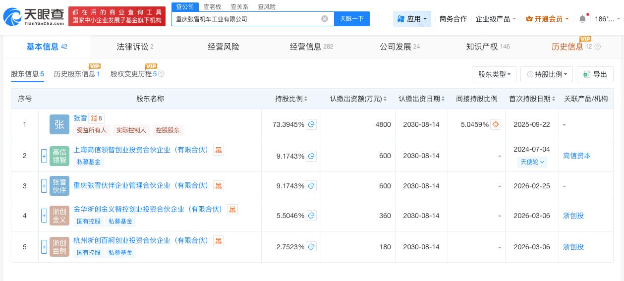 天眼查App显示,张雪机车关联公司重庆张雪机车工业有限公司成立于2024年4月,法定代表人为张雪,经营范围包括道路机动车辆生产、汽车零配件零售、摩托车及零配件零售、摩托车零配件制造、摩托车及零部件研发等。股东信息显示,该公司由张雪、上海高信领智创业投资合伙企业(有限合伙)等共同持股。变更记录显示,今年3月,该公司发生工商变更,新增浙江省创业投资集团旗下金华浙创金义智控创业投资合伙企业(有限合伙)、杭州浙创百舸创业投资合伙企业(有限合伙)为股东,注册资本由6000万人民币增至6540万人民币。