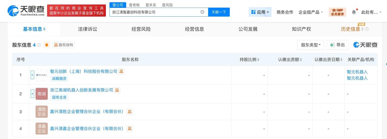 天眼查工商信息显示,近日,浙江清智嘉创科技有限公司成立,法定代表人为李海波,注册资本1000万人民币,经营范围包括人工智能应用软件开发、智能机器人的研发、智能机器人销售、工业机器人销售、伺服控制机构制造等。股东信息显示,该公司由智元机器人关联公司智元创新(上海)科技股份有限公司、浙江南湖机器人创新发展有限公司、嘉兴清胜企业管理合伙企业(有限合伙)、嘉兴清嘉企业管理合伙企业(有限合伙)共同持股。