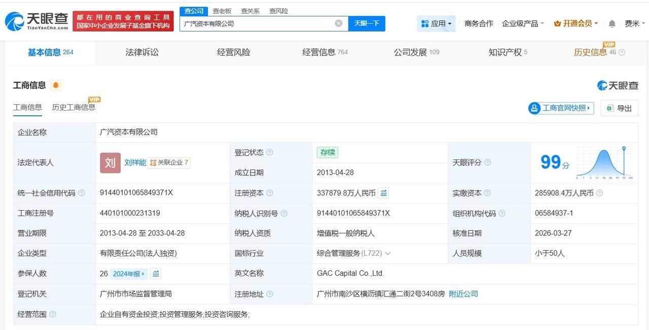 天眼查App显示,近日,广汽资本有限公司发生工商变更,注册资本由约28.6亿人民币增至约33.8亿人民币,增幅约18%。