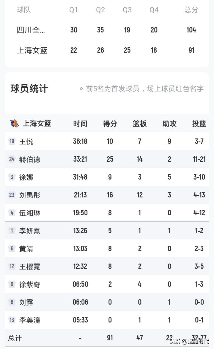 王思雨12+ 高颂13+ 李缘8+7 四川女篮104-91上海 刘雨桐16+12