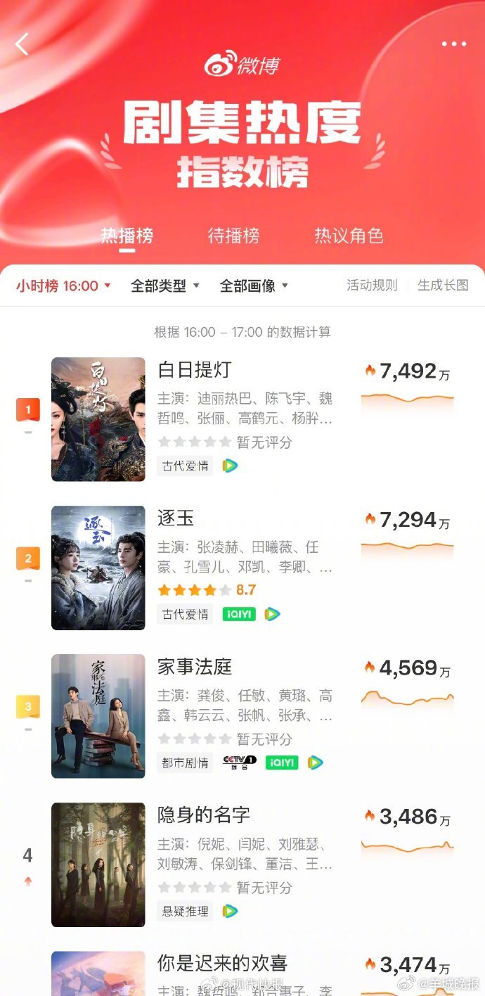 【#迪丽热巴贺思慕热度持续登顶#】由主演的剧集《#白日提灯李荣浩 爱你老己##严