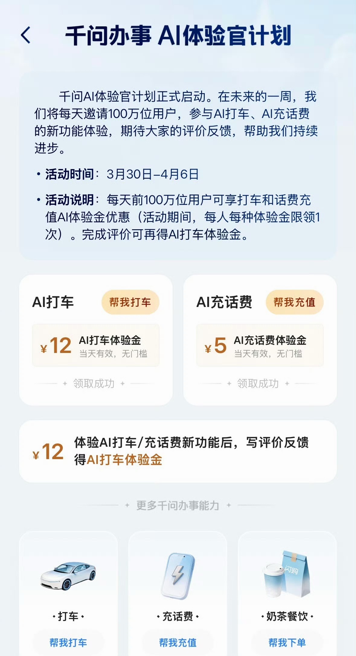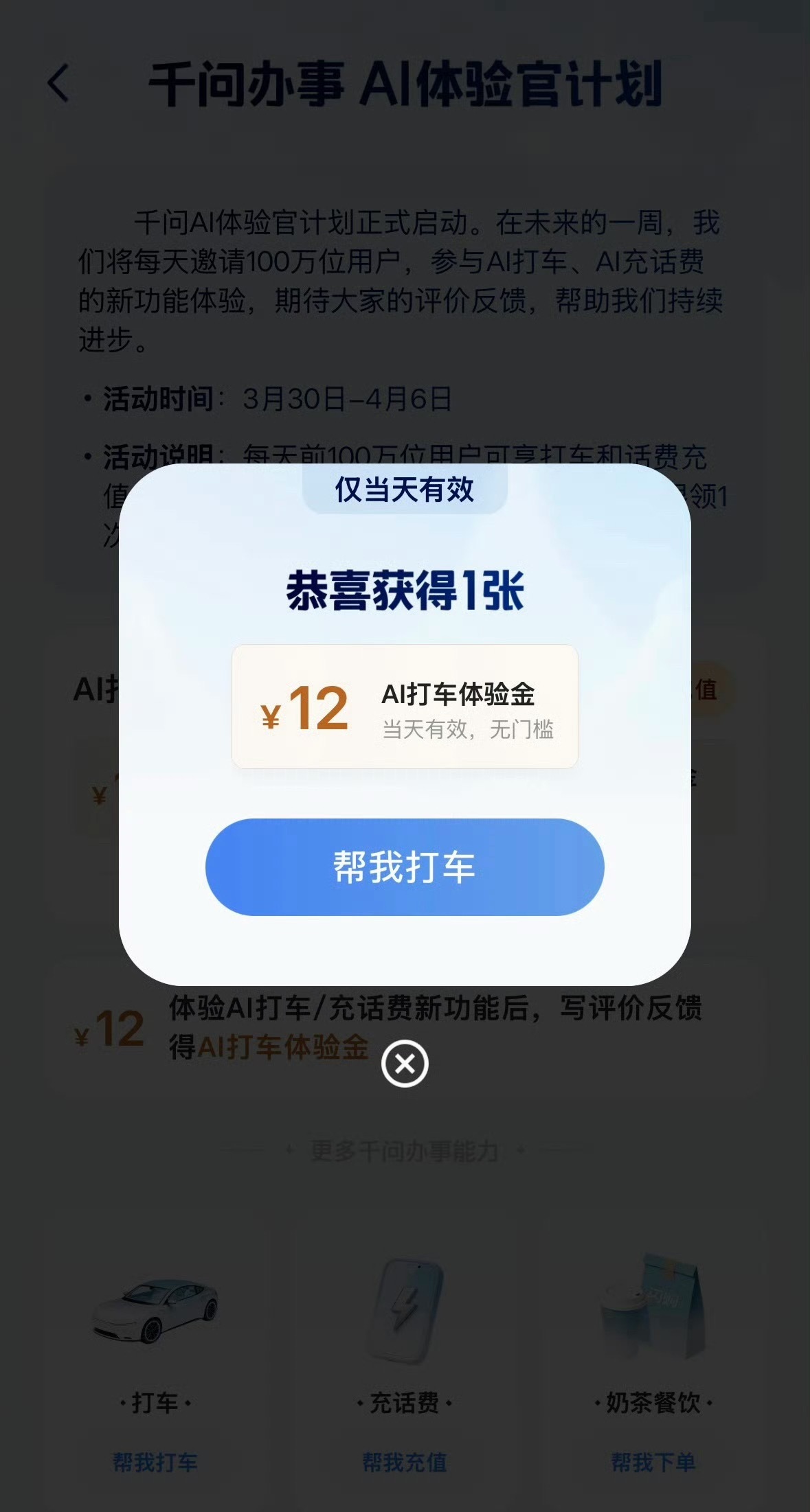 今天打开千问,一张12块钱打车券,一张50-5话费券,又赚到了