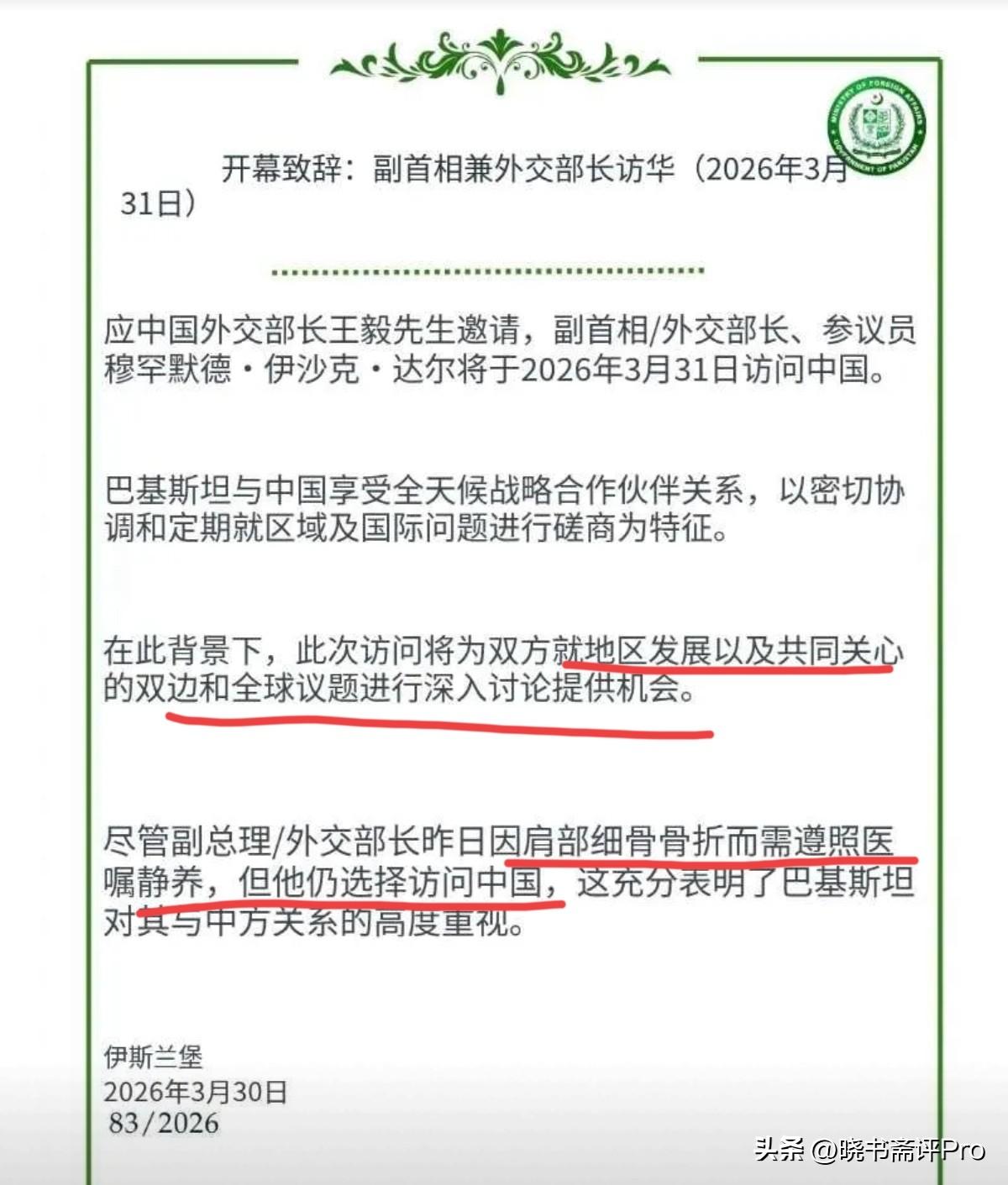 带着肩部细骨骨折也要来中国访问,巴基斯坦直话直说,我们对与中方的关系高度重视。3月30日,巴基斯坦方面发布消息称,应中国外交部长王毅先生邀请,副首相兼外交部长达尔将于2026年3月31日访问中国。巴基斯坦方面透露称,尽管外交部长达尔昨日因肩部细骨骨折,而需遵照医嘱静养,但他仍选择访问中国。 巴方表示,此举这充分表明了巴基斯坦对其与中方关系的高度重视,而访华的目的就是就地区发展以及共同关心的双边和全球议题进行深入讨论提供机会。很显然,面对我们的邀访,巴基斯坦外长虽然身体有恙,但是仍坚持动身访问中国,这种态度,值得给予高度肯定。 为什么巴基斯坦外长马不停蹄的要来华访问呢?这恐怕原因有四,其一,这是向我们传递出一种强烈的信号,也就是无论国际局势如何变幻,中巴关系的核心地位不会动摇,这样的访问可以说是一次政治表态。其二,巴基斯坦国内面临一系列的困难,比如债务问题,金融稳定问题。与此同时,巴基斯坦还希望我们继续加大中巴经济走廊在基础设施,能源设施等方面的投资。 其三,巴基斯坦希望就区域重点问题跟我们进行磋商,这包括巴基斯坦与阿富汗近期的冲突,印巴紧张关系,以及眼下的中东局势等等。其四,巴基斯坦既希望我们为其安全保障作背书,也希望我们支持巴基斯坦斡旋当下中东局势。事情是明摆着的,当下紧张局势,巴基斯坦既是调停者,也面临卷入的风险,背靠中国,巴基斯坦会更加的有底气。很显然,此次巴基斯坦外长来访,是一次很重要的访问,预期双方会取得一系列的成果。